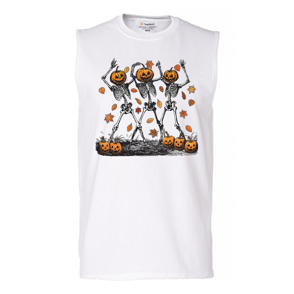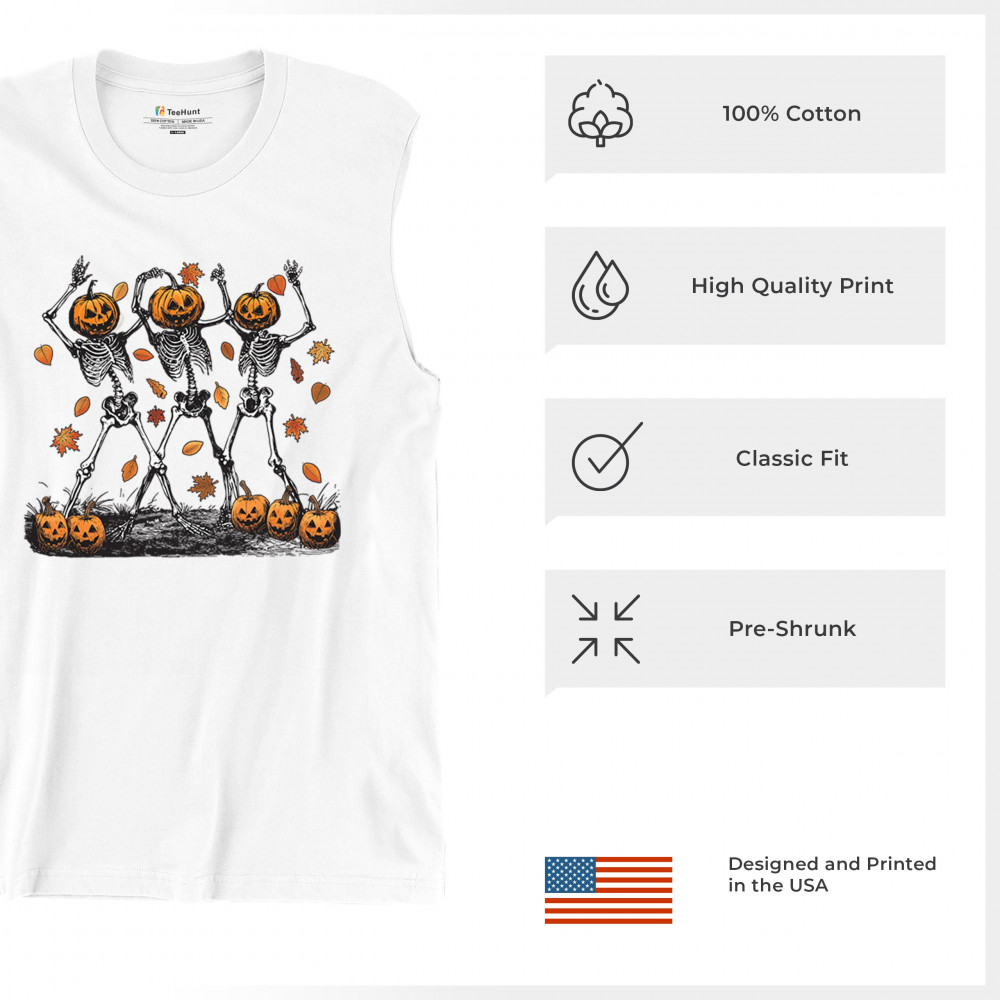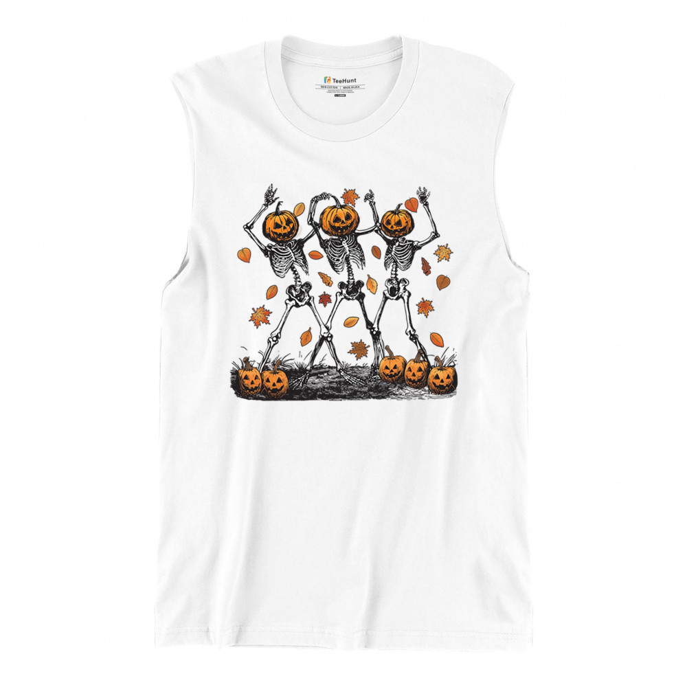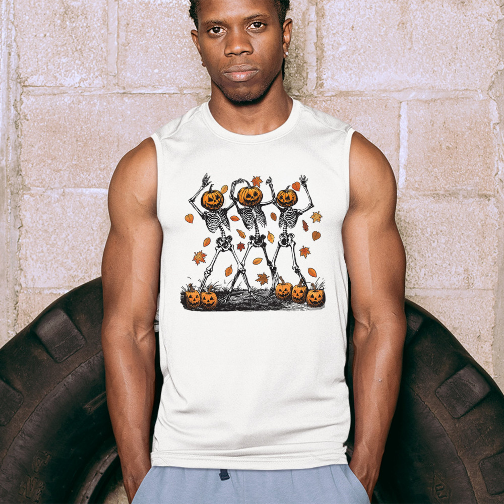 Add a touch of spooky fun to your wardrobe with this lively design featuring pumpkin-headed skeletons dancing through a swirl of autumn leaves. Perfect for Halloween parties, trick-or-treating, and fall festivals, this design is a must-have for anyone who enjoys the whimsical side of the spooky season. Made with comfort and quality in mind, this is the perfect apparel for all your October gatherings and events. Wear it to show off your Halloween spirit!