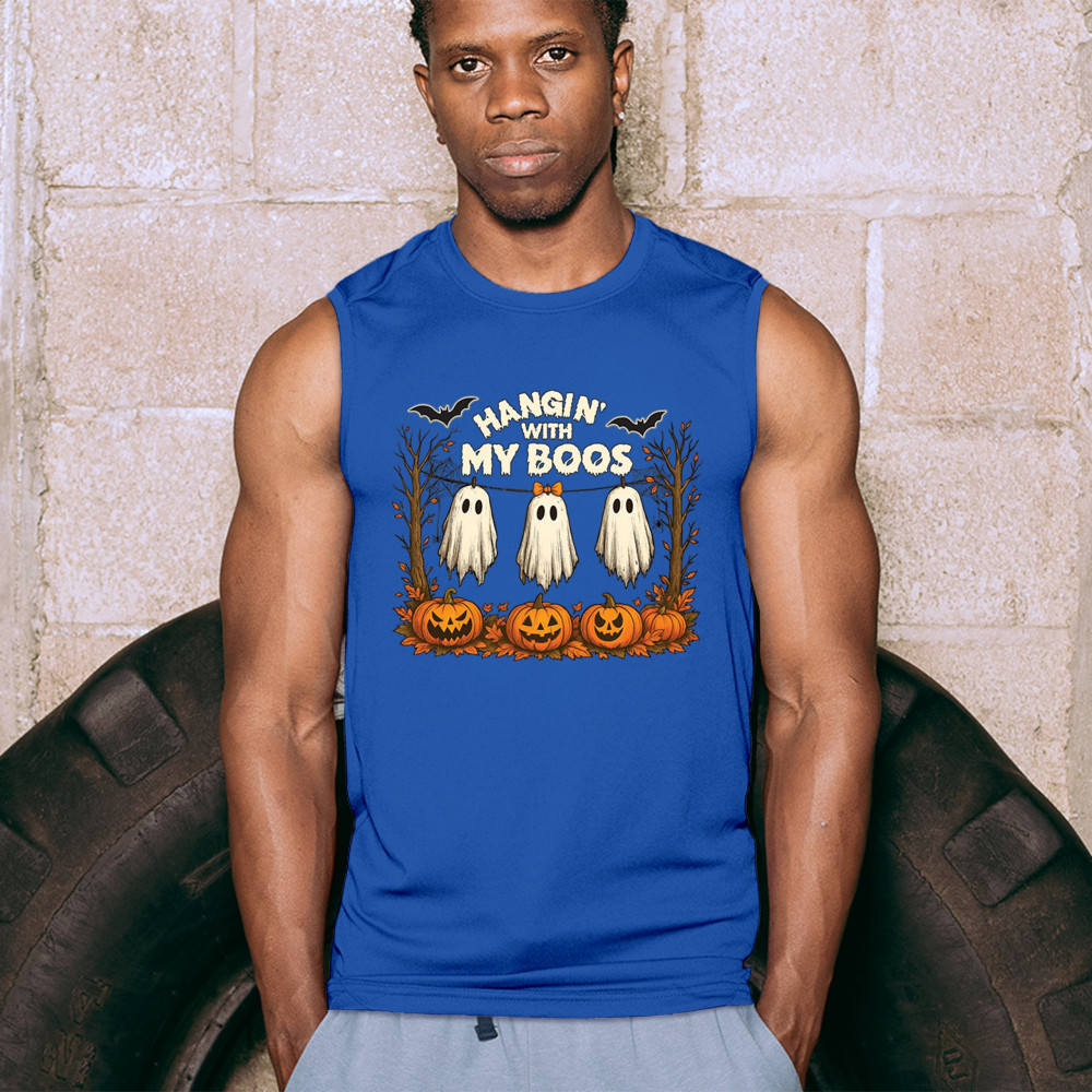 Hangin With My Boos design featuring spooky ghosts, jack o lanterns, and haunted house humor. Perfect for Halloween night, October 31, and parties.