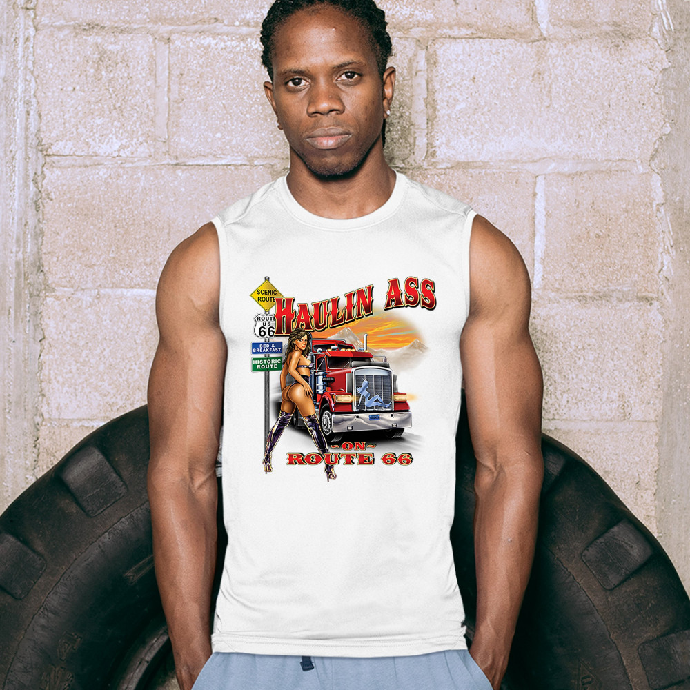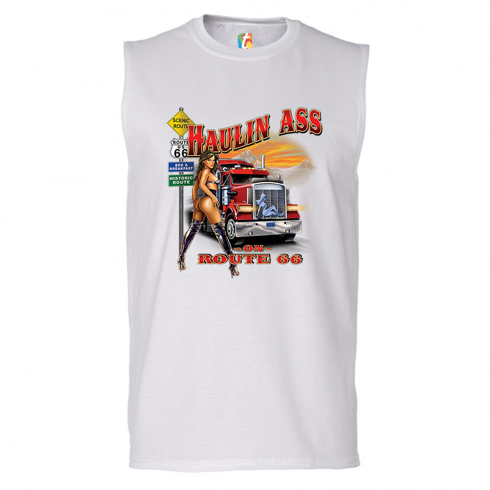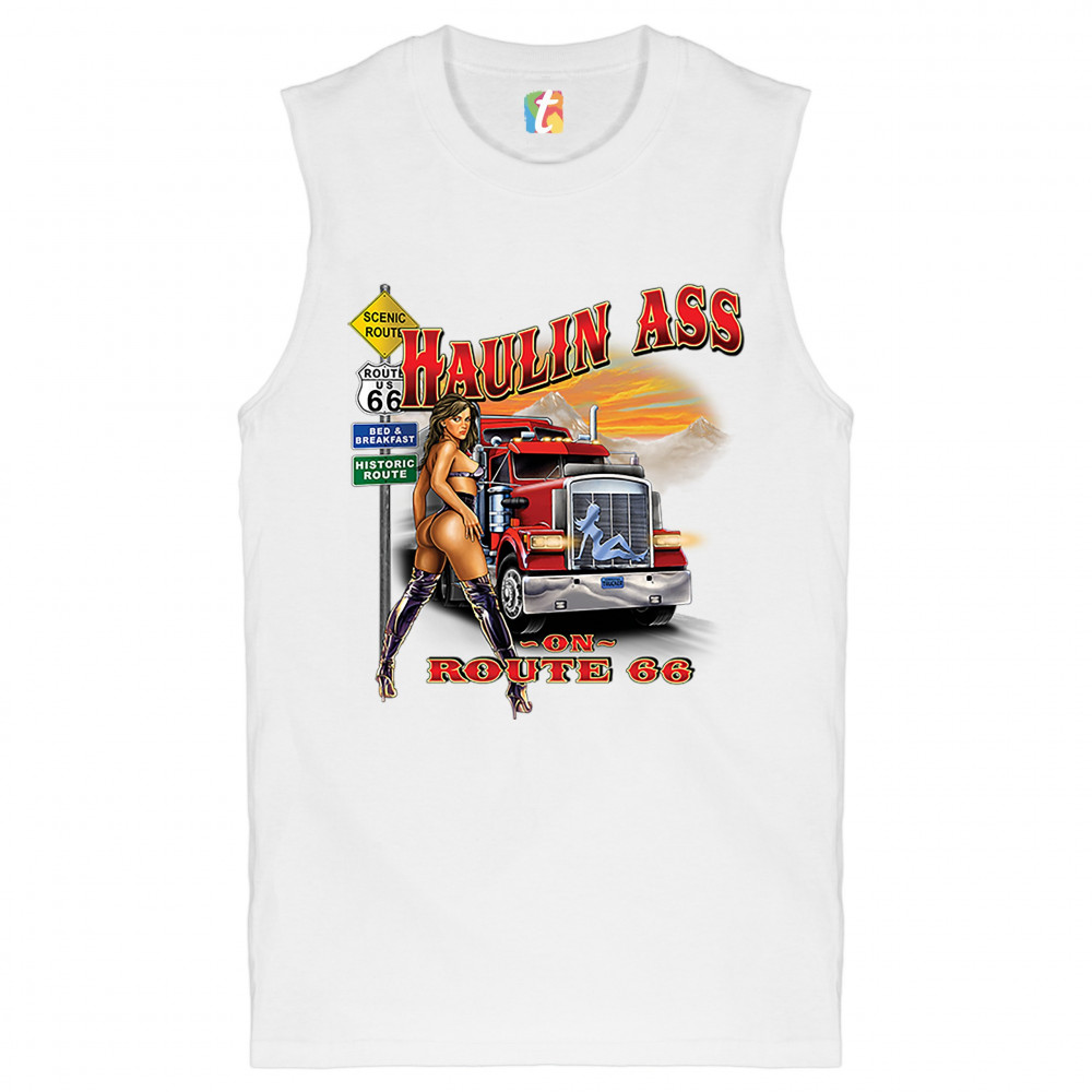 A print featuring a scantily-clad brunette woman standing by a Route 66 sign. A classic truck is passing by and the print says: "Haulin Ass on Route 66". A great choice for anyone who appreciates beautiful women and is a fan of the legendary Mother Road.