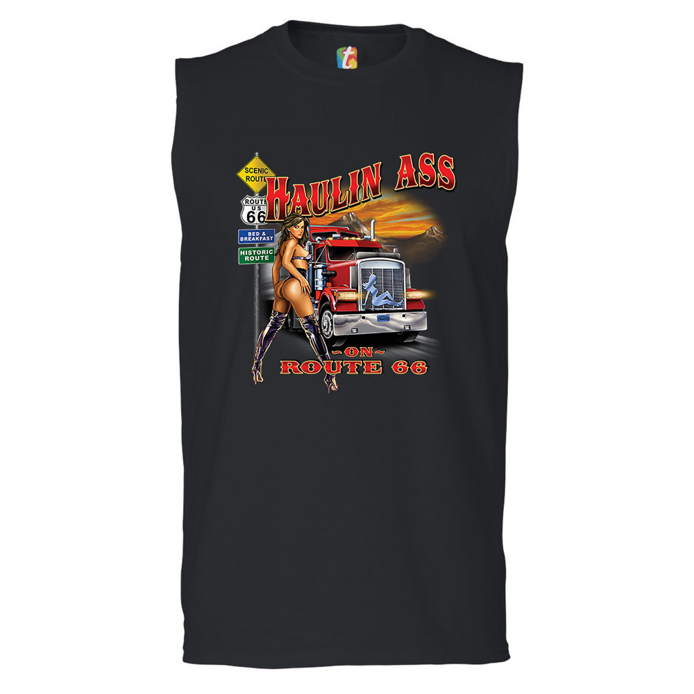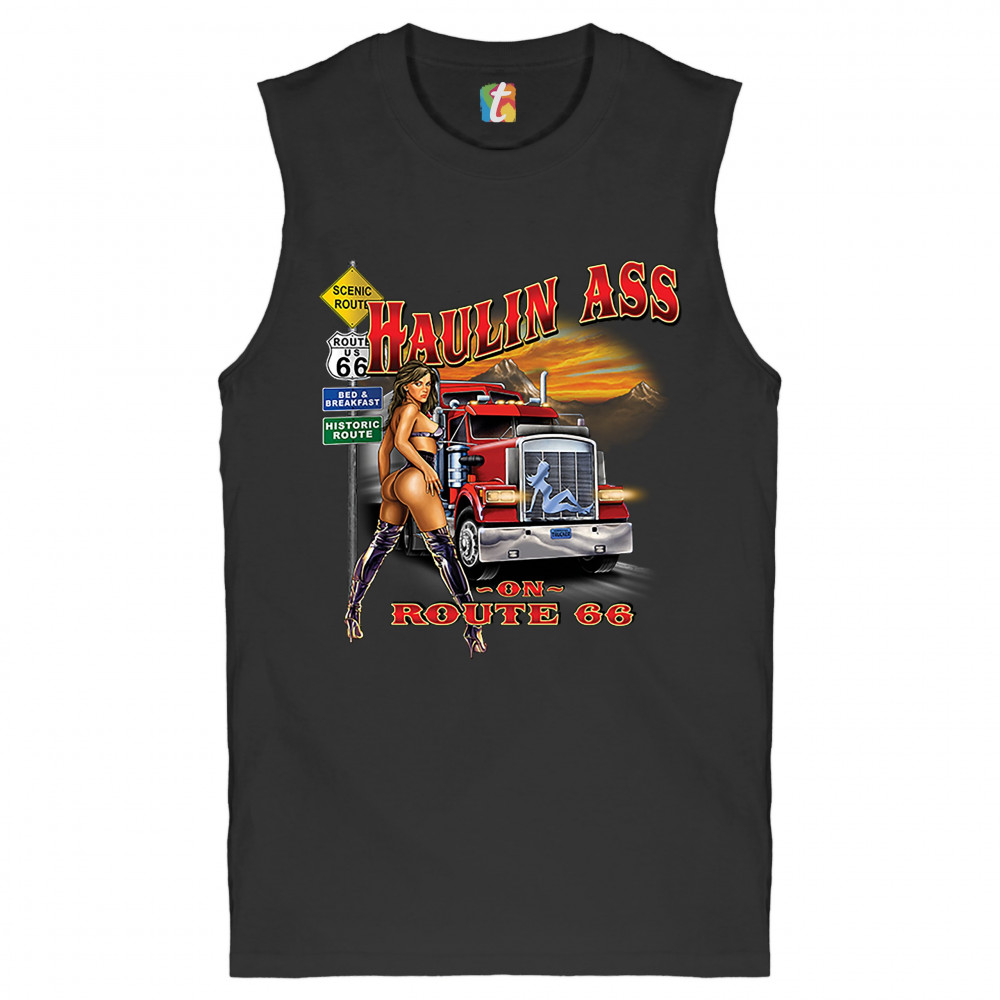 A print featuring a scantily-clad brunette woman standing by a Route 66 sign. A classic truck is passing by and the print says: "Haulin Ass on Route 66". A great choice for anyone who appreciates beautiful women and is a fan of the legendary Mother Road.