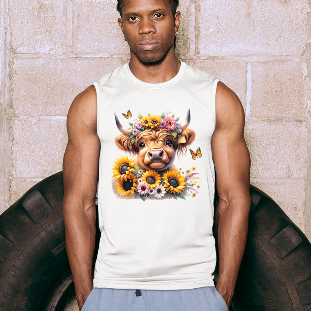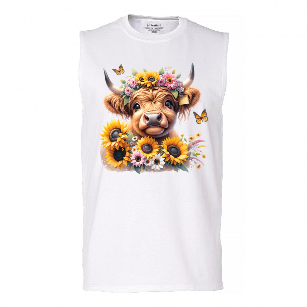 Highland Cow floral design with sunflowers and daisies, rustic farmhouse cow style, western ranch boho charm, and cozy country farmhouse shirt vibes.