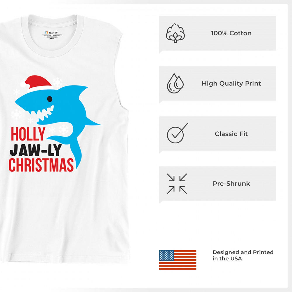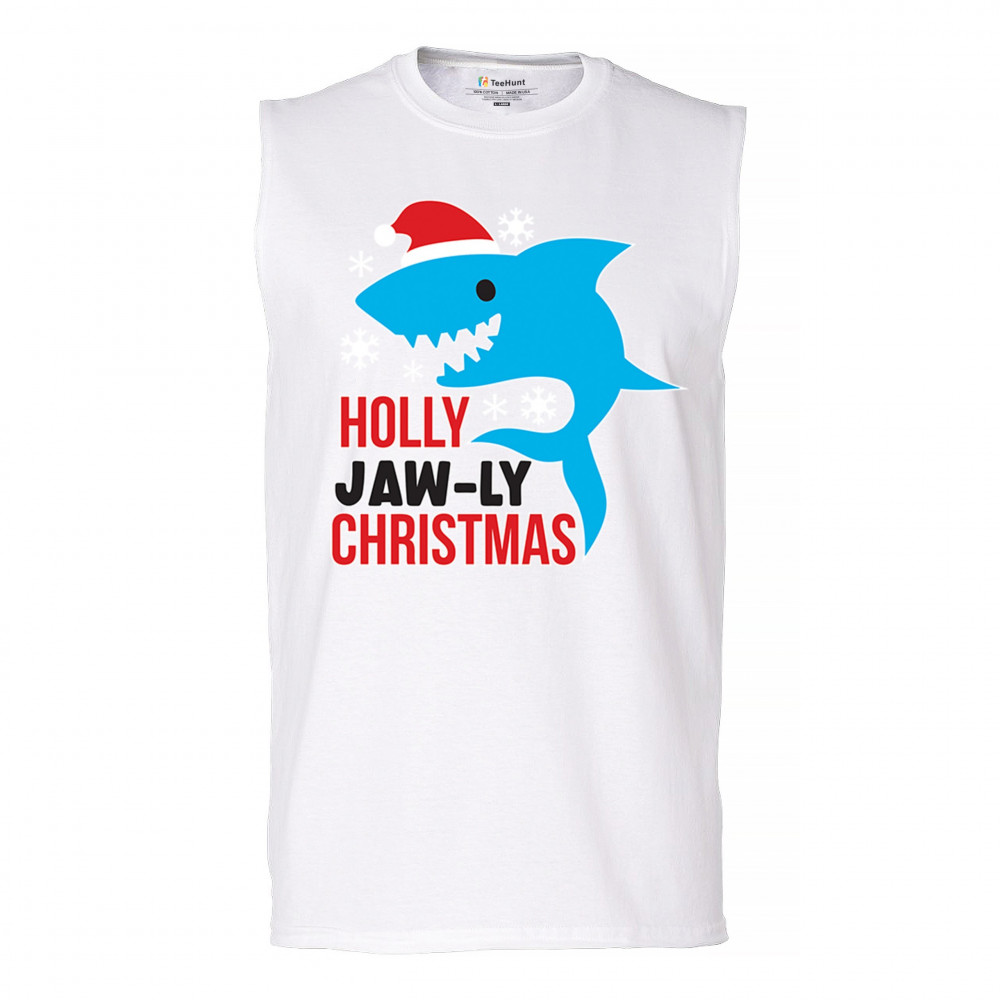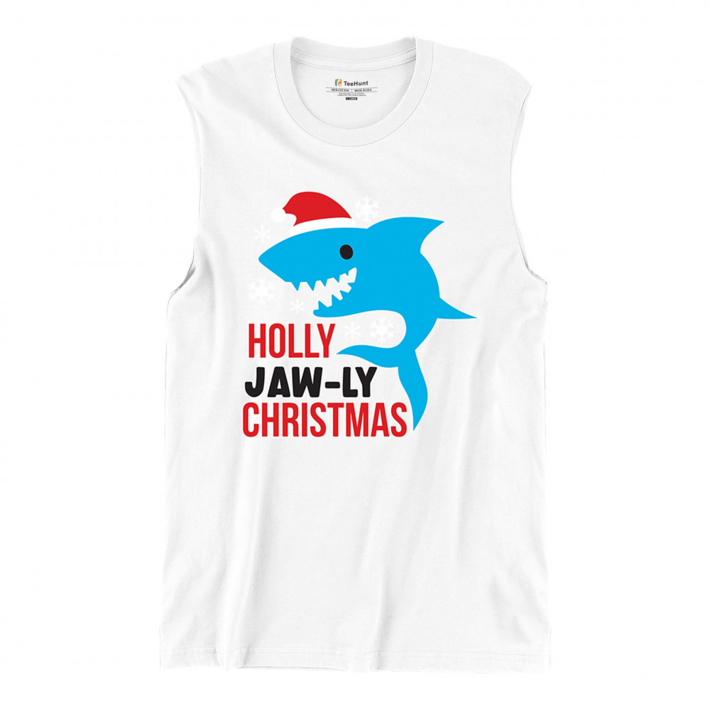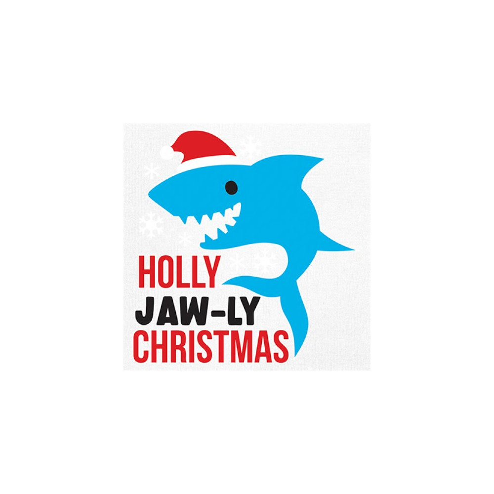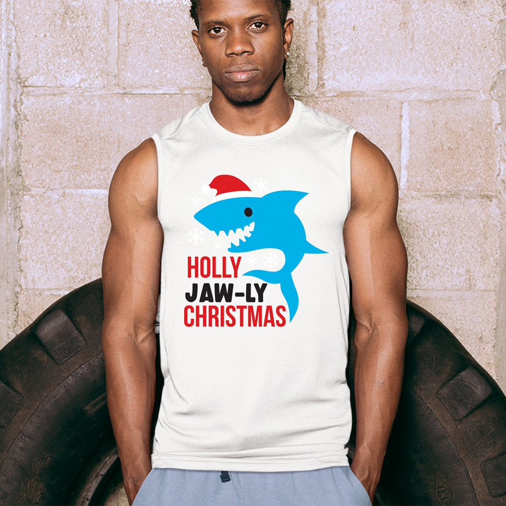 Funny Holly Jaw-ly Christmas shark pun design with Santa hat and snowflakes. Perfect for ocean lovers, festive parties, and cheerful holiday fun.