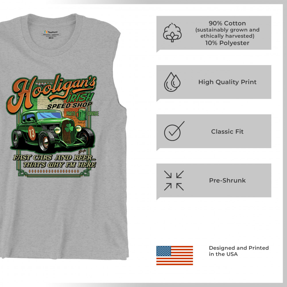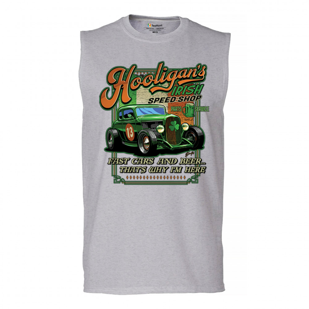 HOOLIGAN'S IRISH SPEED SHOP hooligans irish speed shop st patricks day muscle shirt hot rod shamrock men's gray