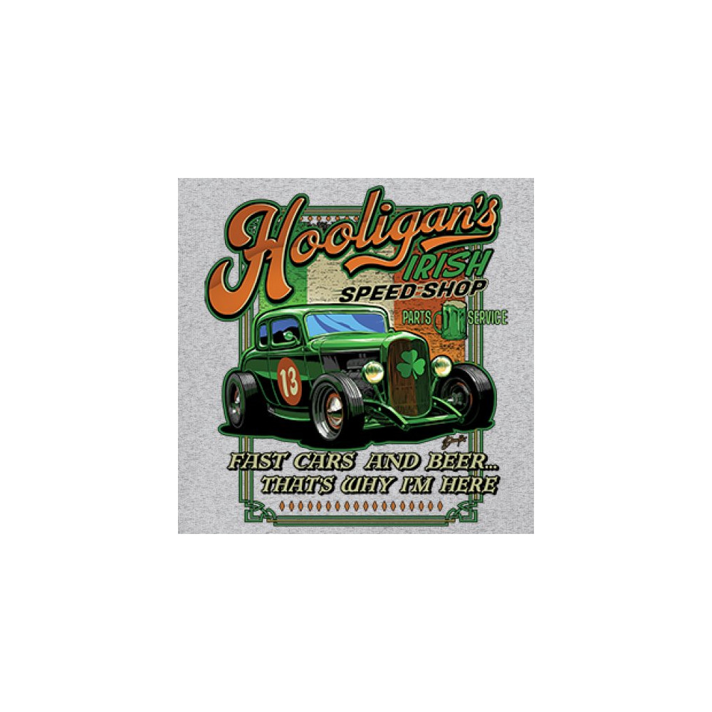 Celebrate St. Patrick's Day in style with the Hooligan Speed Shop T-Shirt, featuring a bold design of the Irish flag perfect for showcasing your pride while adding flair to any festive occasion.