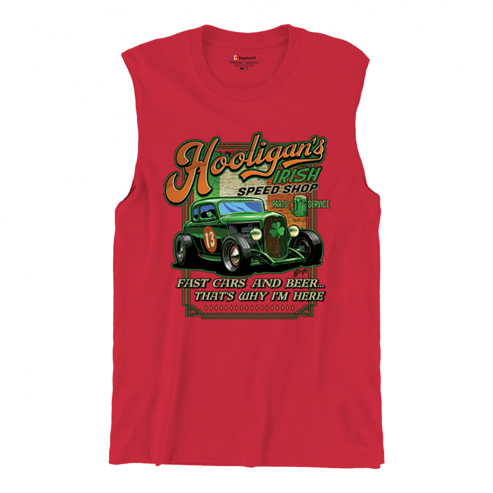 HOOLIGAN'S IRISH SPEED SHOP hooligans irish speed shop st patricks day muscle shirt hot rod shamrock men's red