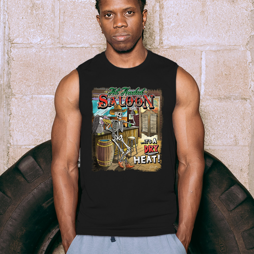 Raise a glass to style with our 'Hot Headed Saloon' t-shirt! Featuring a skeletal mixologist in a desert tavern, this tee blends humor with high-stakes western drama. Crafted for those who take their style like their whiskey – strong and full of character – it's more than just apparel; it's a wearable tale of the wild, wild west. Add this conversation piece to your collection and tip your hat to a bygone era with a laugh.