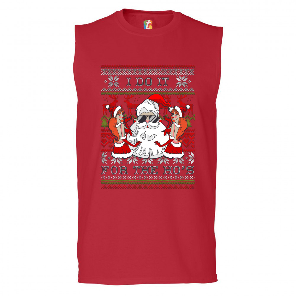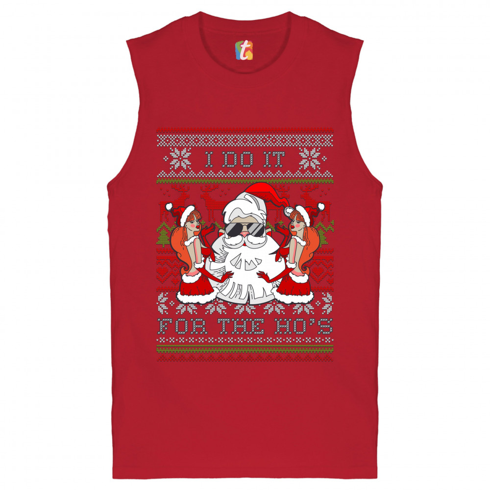 A funny print saying: "I do it for the ho's". It features a badass Santa Claus wearing sunglasses and two sexy girls in revealing Christmas outfits leaning on Santa's beard. The print is decorated wit the ugly sweater pattern in the background. Amazing ch