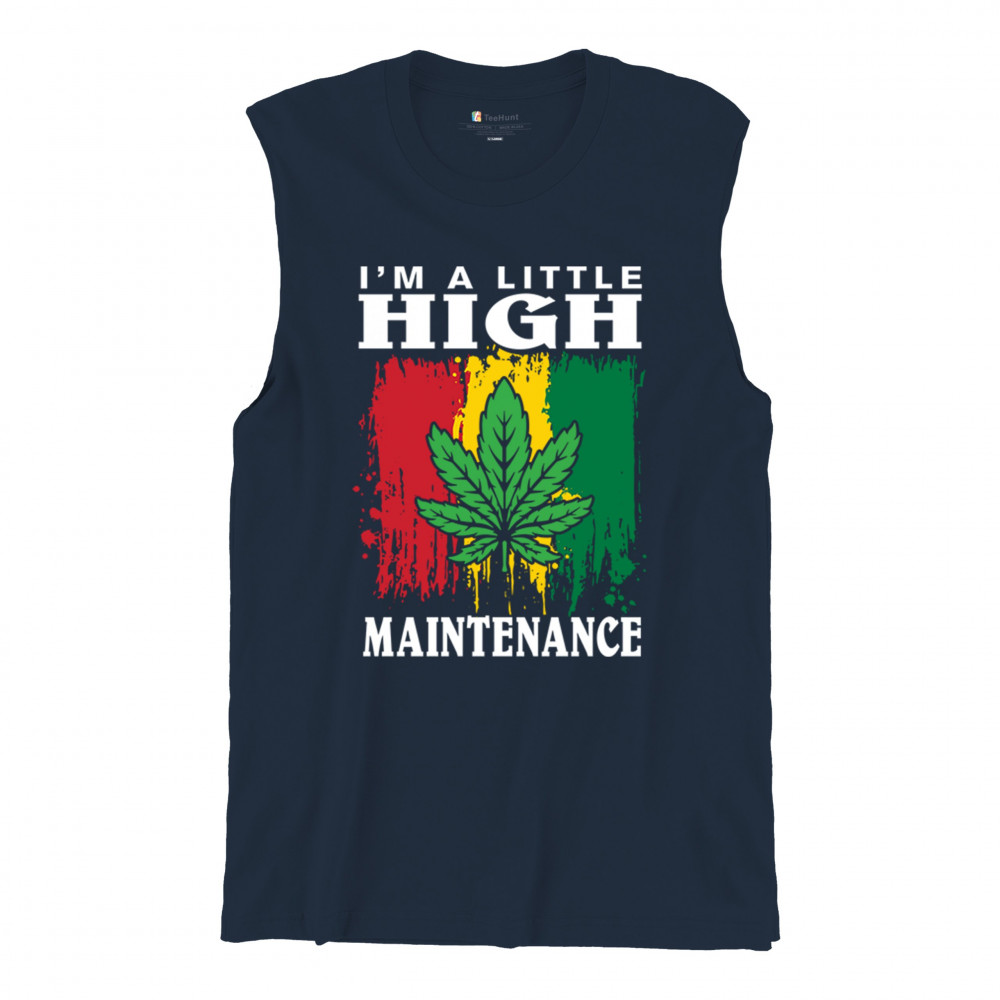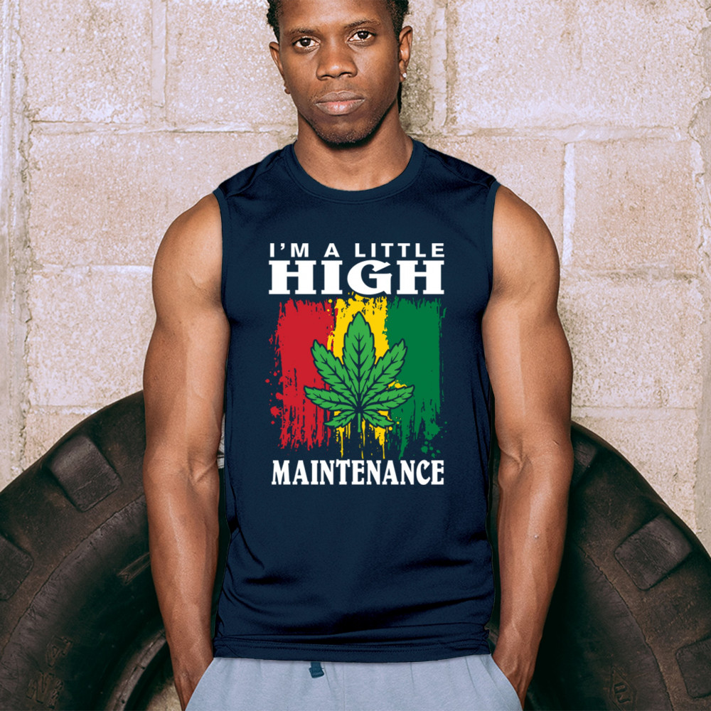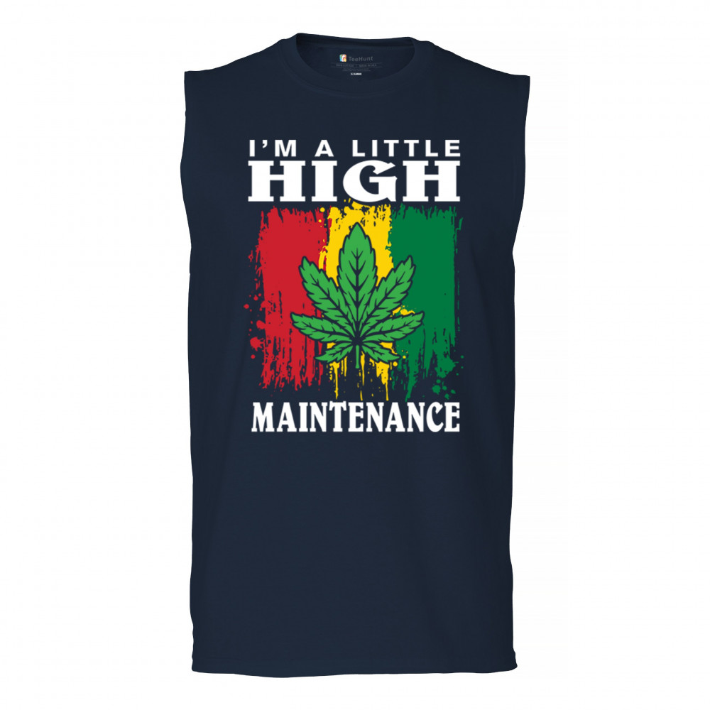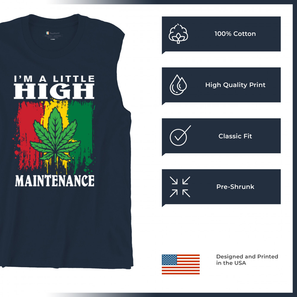 "I'm a Little High Maintenance" design with a bold cannabis leaf and vibrant background. Perfect for fans of Mary Jane, humor, and relaxed, trippy style.