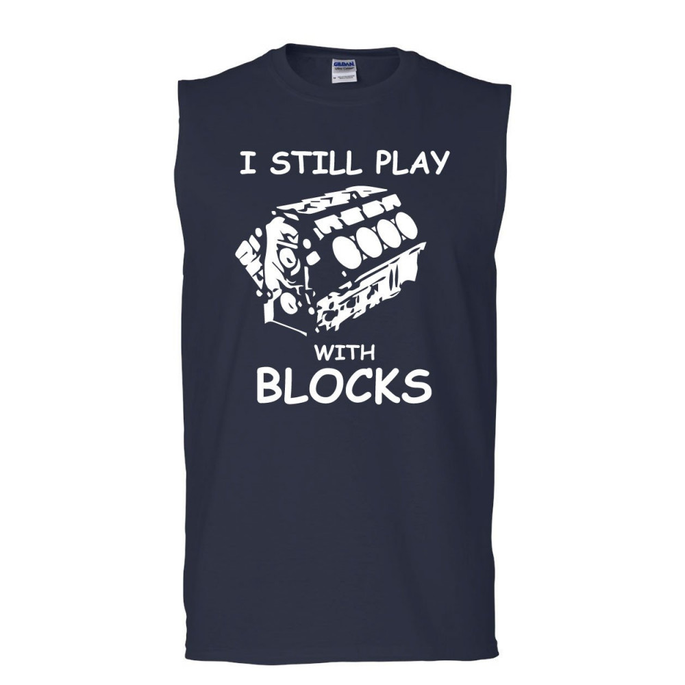 I STILL PLAY WITH BLOCKS muscle shirt funny car mechanic engine navy blue