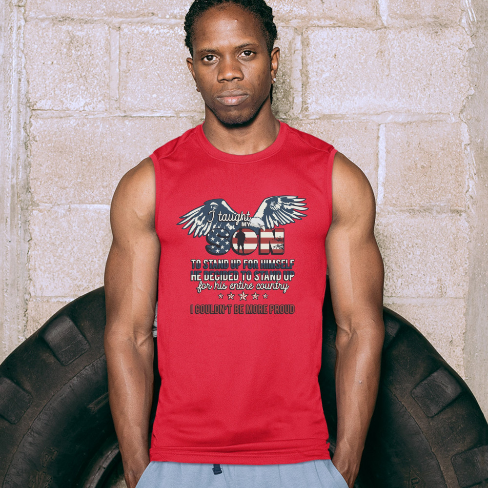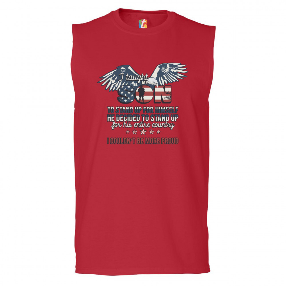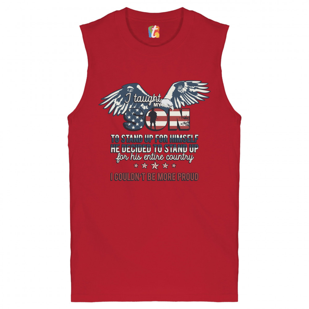 A patriotic print saying: "I Taught My Son to Stand up for Himself, He Decided to Stand Up for His Entire Country, I Couldn't Be More Proud". The print features a bald eagle, several stars and a small silhouette of a soldier inside of a letter "O" in "Son