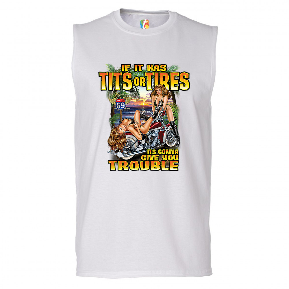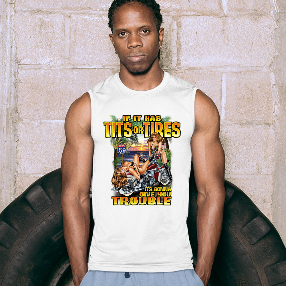 A print featuring two barely dressed sexy women leaning on a vintage motorcycle parked at the beach. There is a "Route 69" road sign in the background. The print says: "If it has tits or tires it's gonna give you trouble". A great choice for a motorcycle