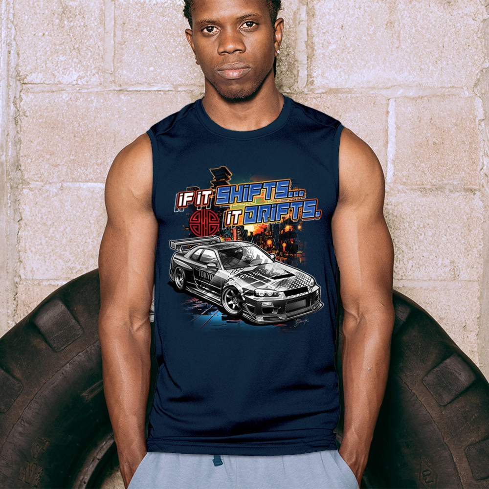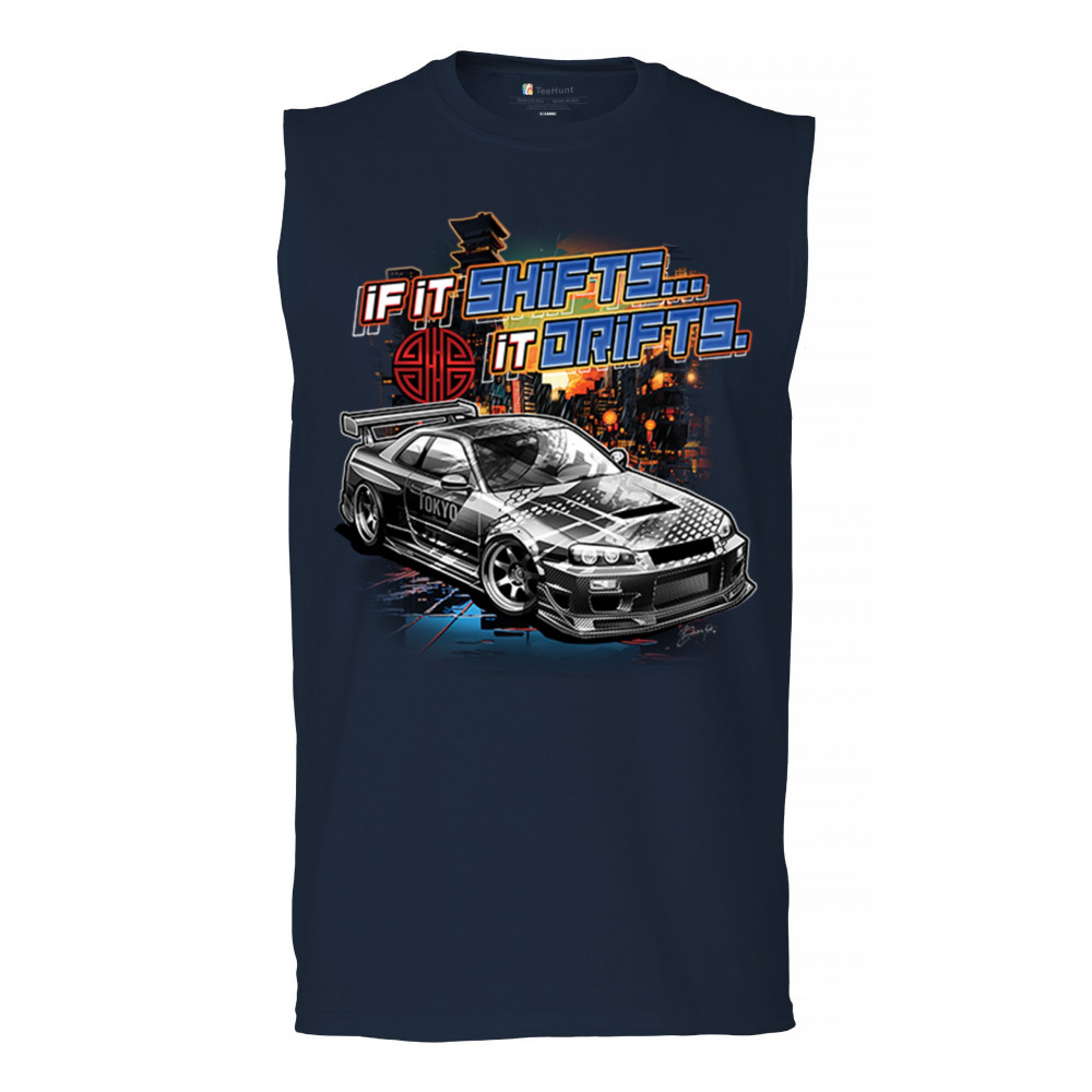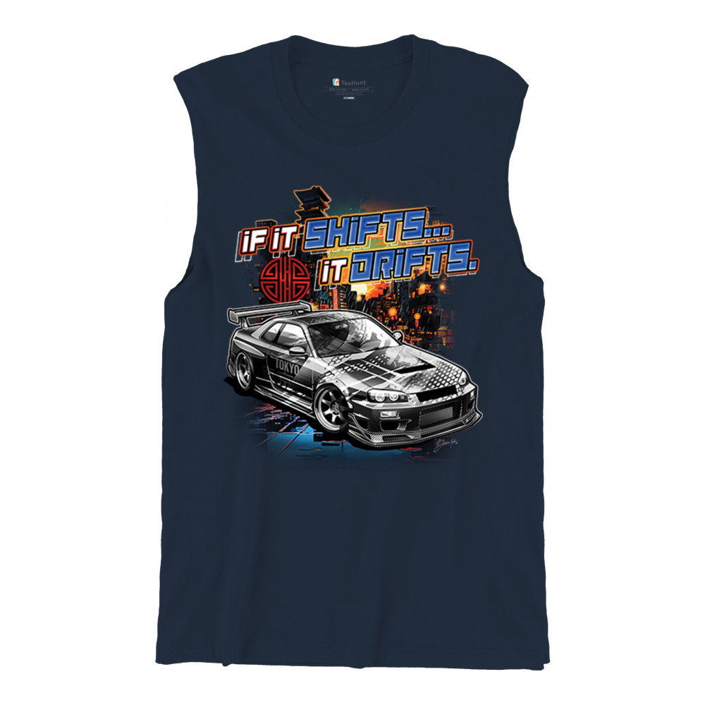 "If It Shifts, It Drifts" design. Perfect for car enthusiasts, featuring a detailed car and vibrant cityscape. Comfortable, durable, and stylish.