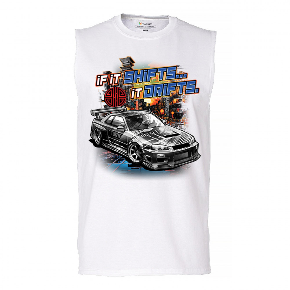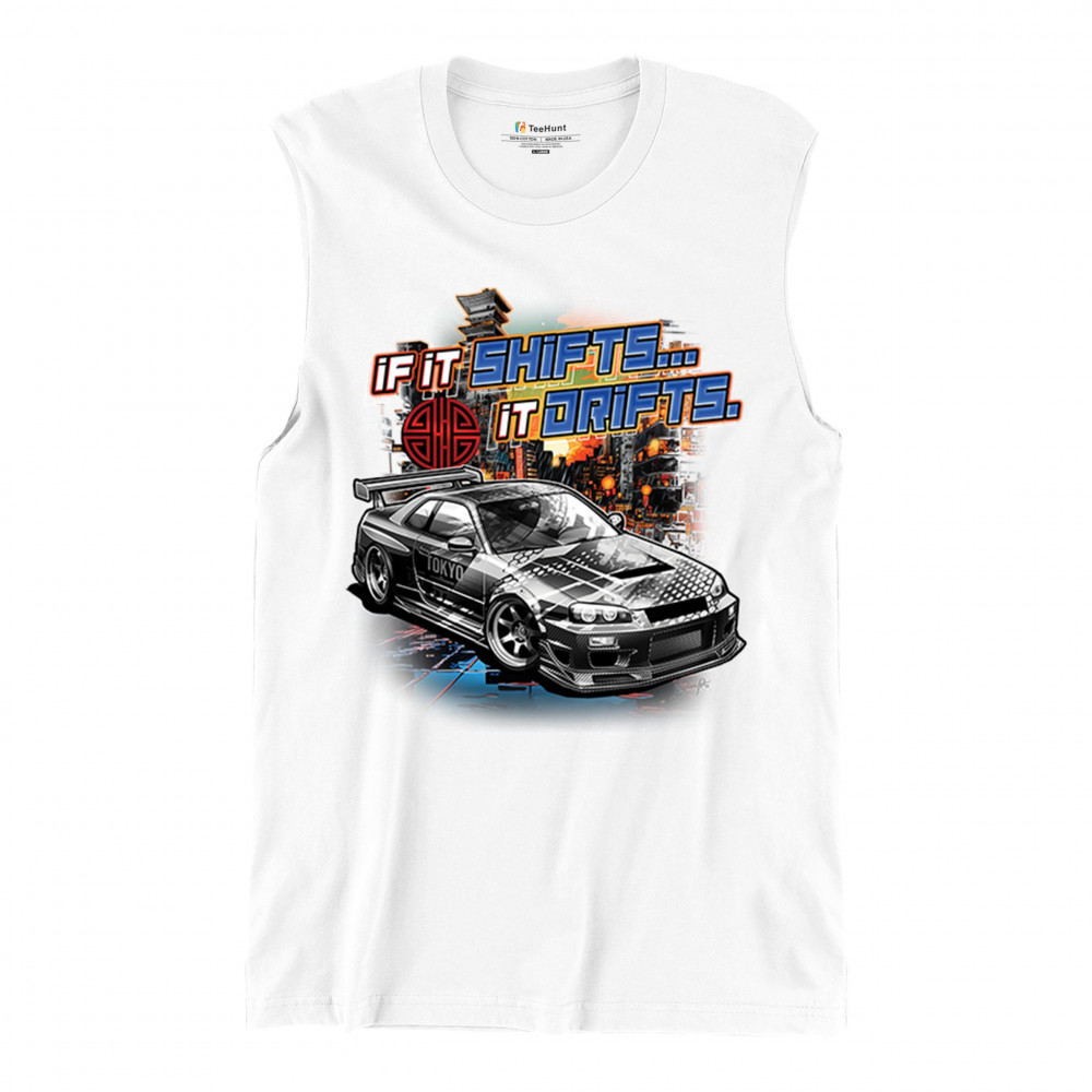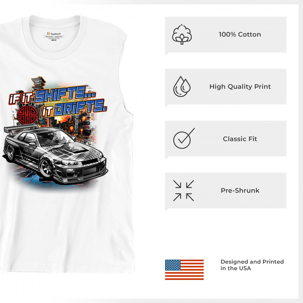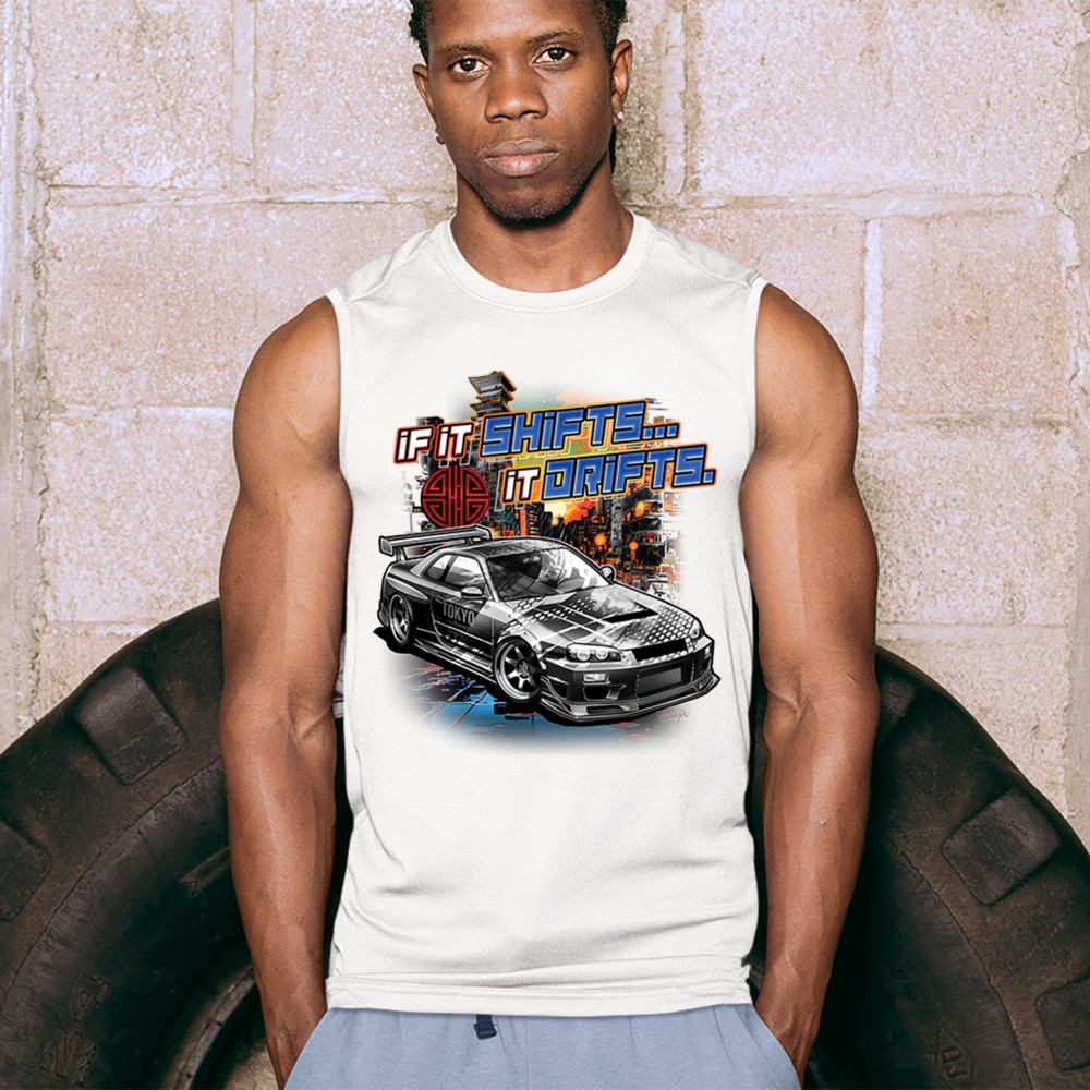 "If It Shifts, It Drifts" design. Perfect for car enthusiasts, featuring a detailed car and vibrant cityscape. Comfortable, durable, and stylish.