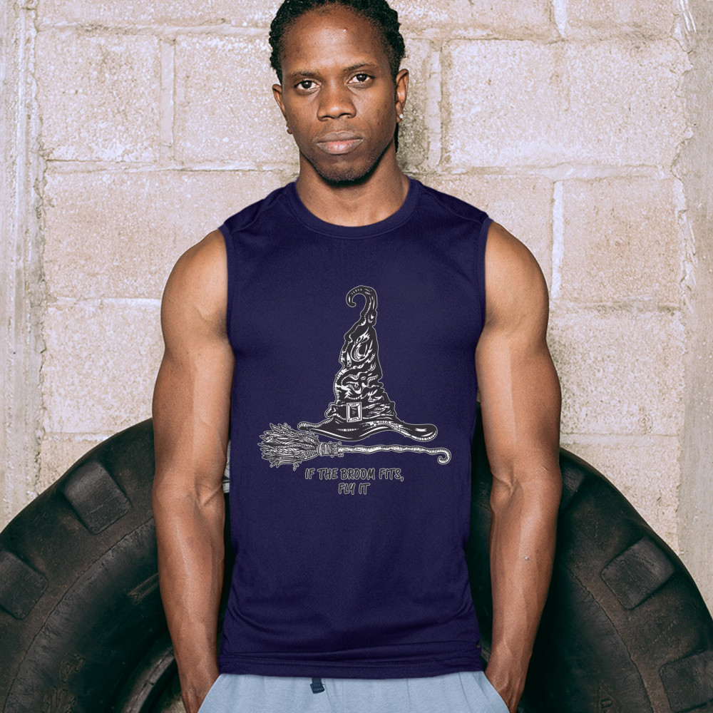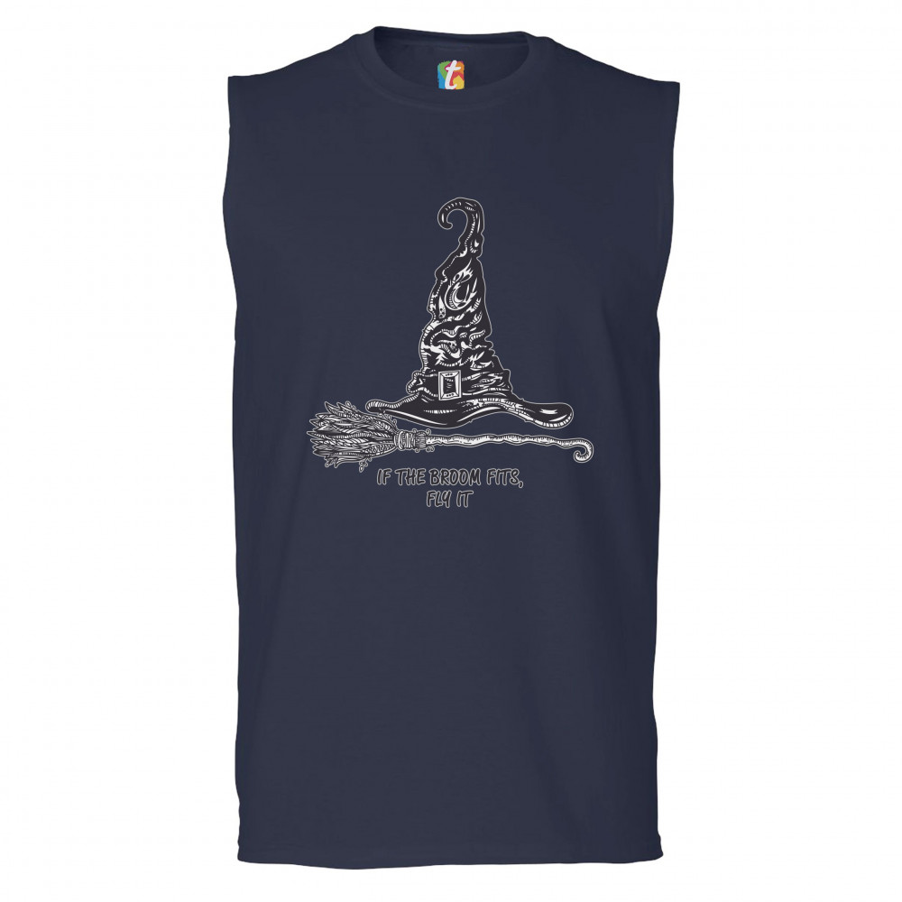 IF THE BROOM FITS, FLY IT muscle shirt funny witch hat halloween men's navy blue