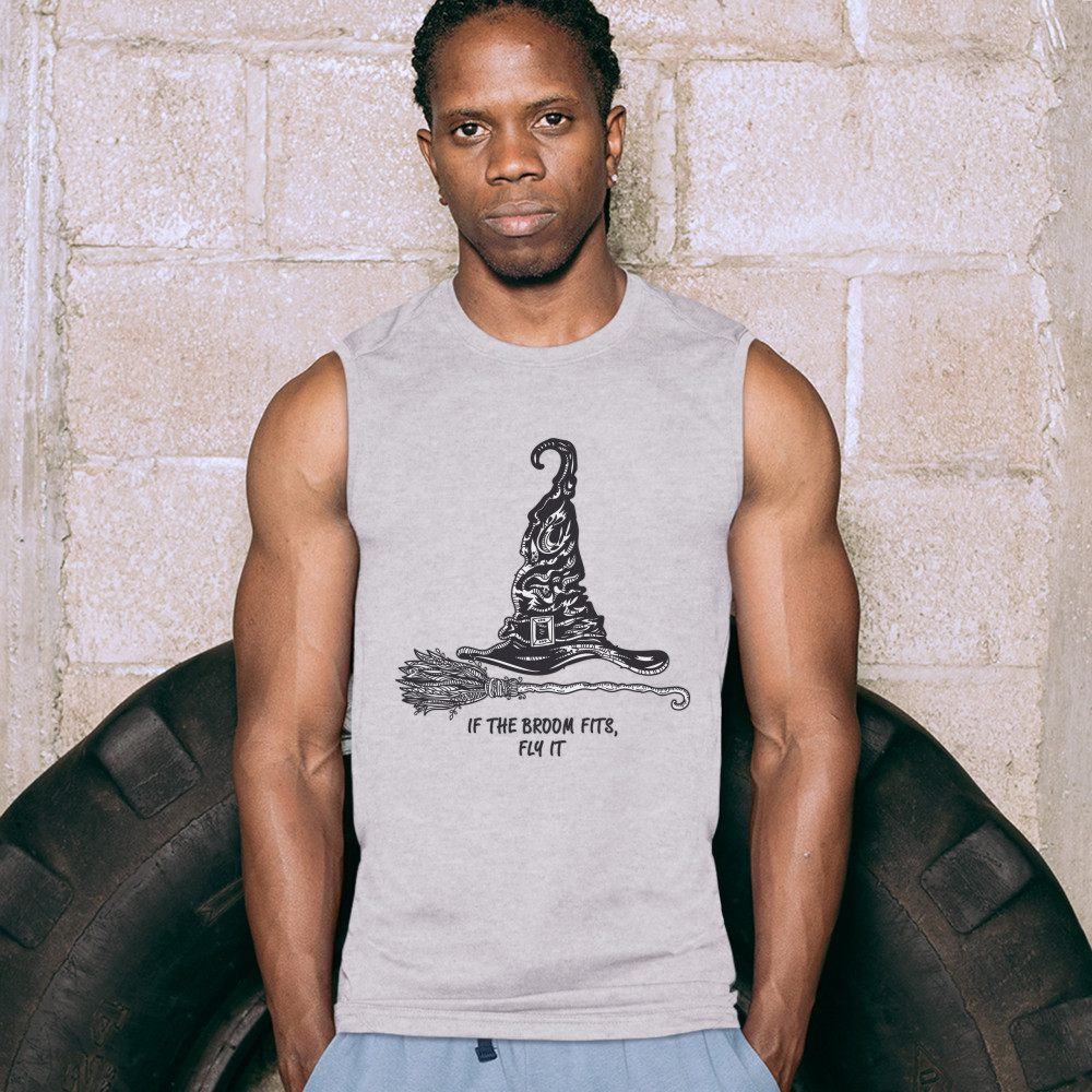 IF THE BROOM FITS, FLY IT muscle shirt funny witch hat halloween men's gray