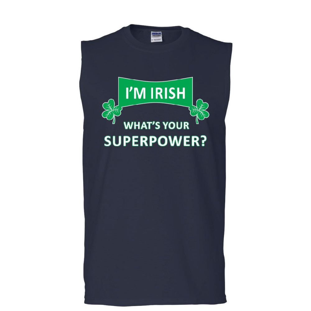 I'M IRISH WHAT'S YOUR SUPERPOWER? muscle shirt irish shamrock clover sleeveless navy blue