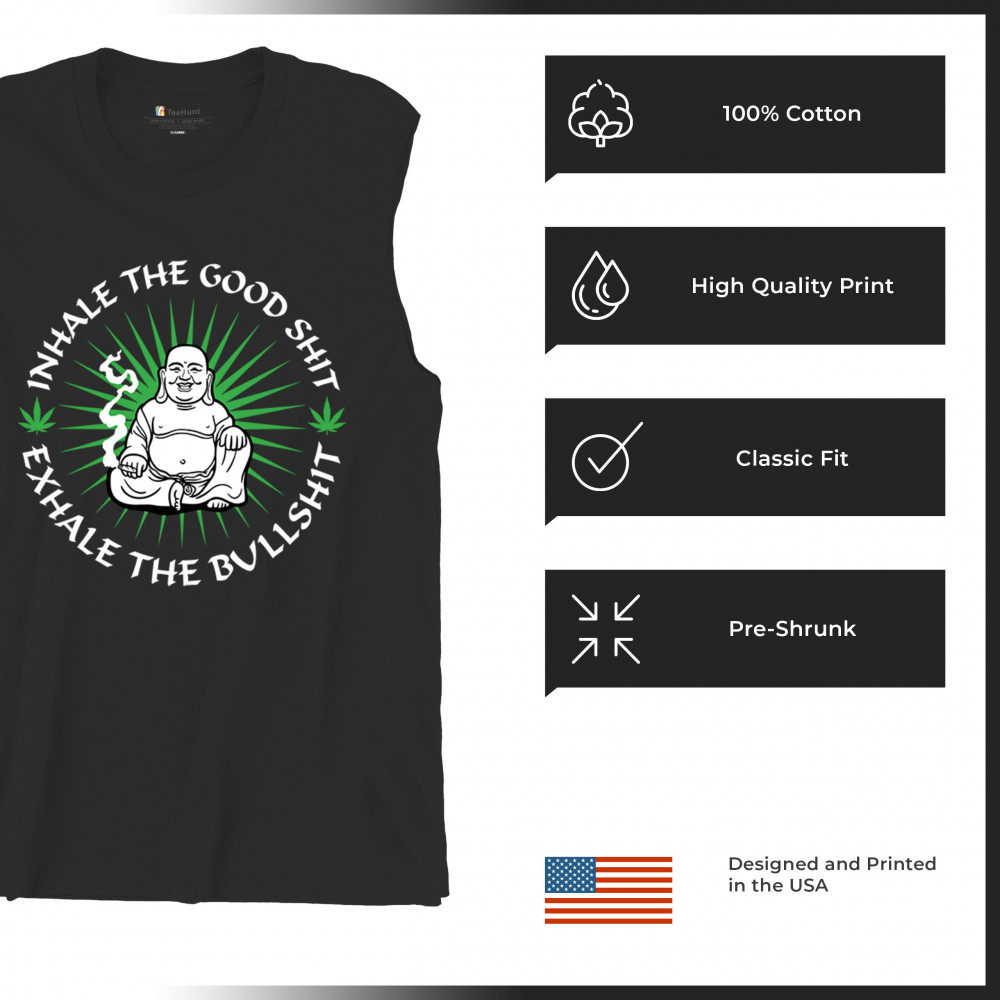 This hilarious and zen-inspired design features a happy Buddha with a joint, surrounded by cannabis leaves. “Inhale the Good Shit, Exhale the Bullshit†delivers chill stoner wisdom with a wink. Ideal for mindful marijuana lovers, 420 fans, or spiritual rebels with a sense of humor and a love for weed.