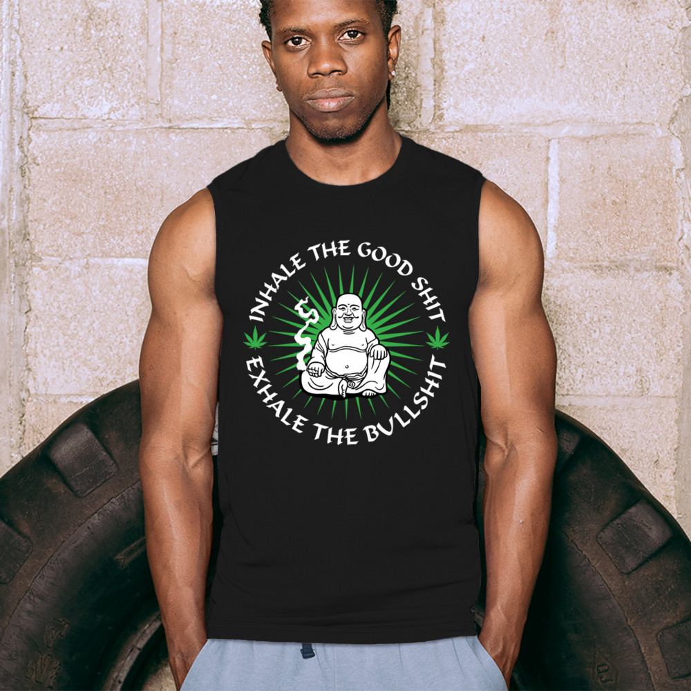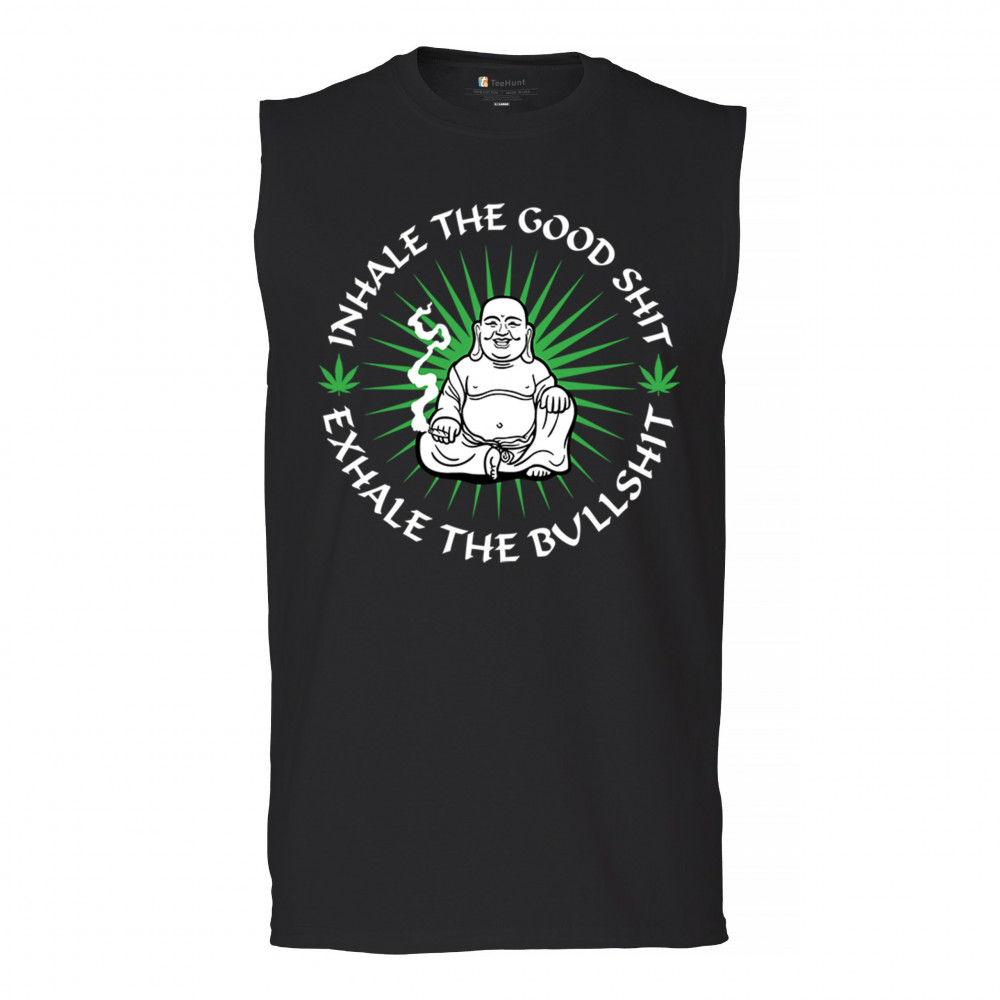Stoner Buddha design with weed leaves and funny zen slogan—perfect for chill 420 lovers who inhale peace and exhale the BS.