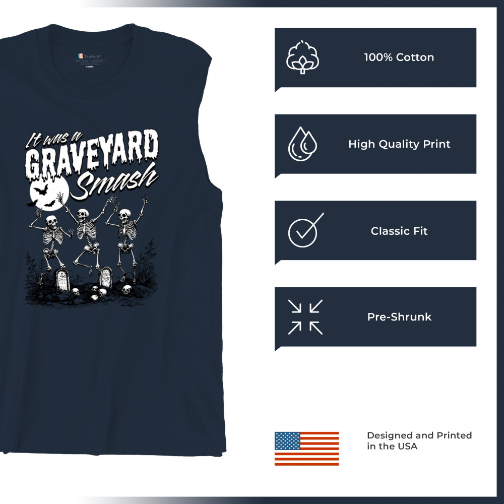 Add a touch of spooky fun to your Halloween attire with this "Graveyard Smash" design, showcasing skeletons dancing under the moonlight in a graveyard. Ideal for anyone who loves Halloween, this graphic tee is perfect for parties, haunted houses, or casual trick-or-treating. Made from high-quality materials, it offers both comfort and style, ensuring you look great while embracing the festive spirit. Available in multiple sizes, this shirt is a must-have for your Halloween collection.