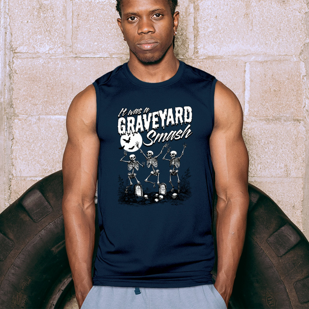 Celebrate Halloween with a fun "Graveyard Smash" design featuring dancing skeletons. Perfect for parties and haunted house events!
