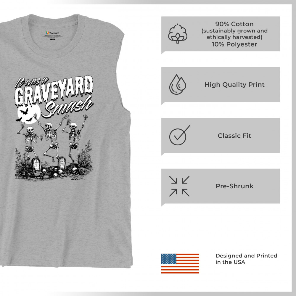 Add a touch of spooky fun to your Halloween attire with this "Graveyard Smash" design, showcasing skeletons dancing under the moonlight in a graveyard. Ideal for anyone who loves Halloween, this graphic tee is perfect for parties, haunted houses, or casual trick-or-treating. Made from high-quality materials, it offers both comfort and style, ensuring you look great while embracing the festive spirit. Available in multiple sizes, this shirt is a must-have for your Halloween collection.