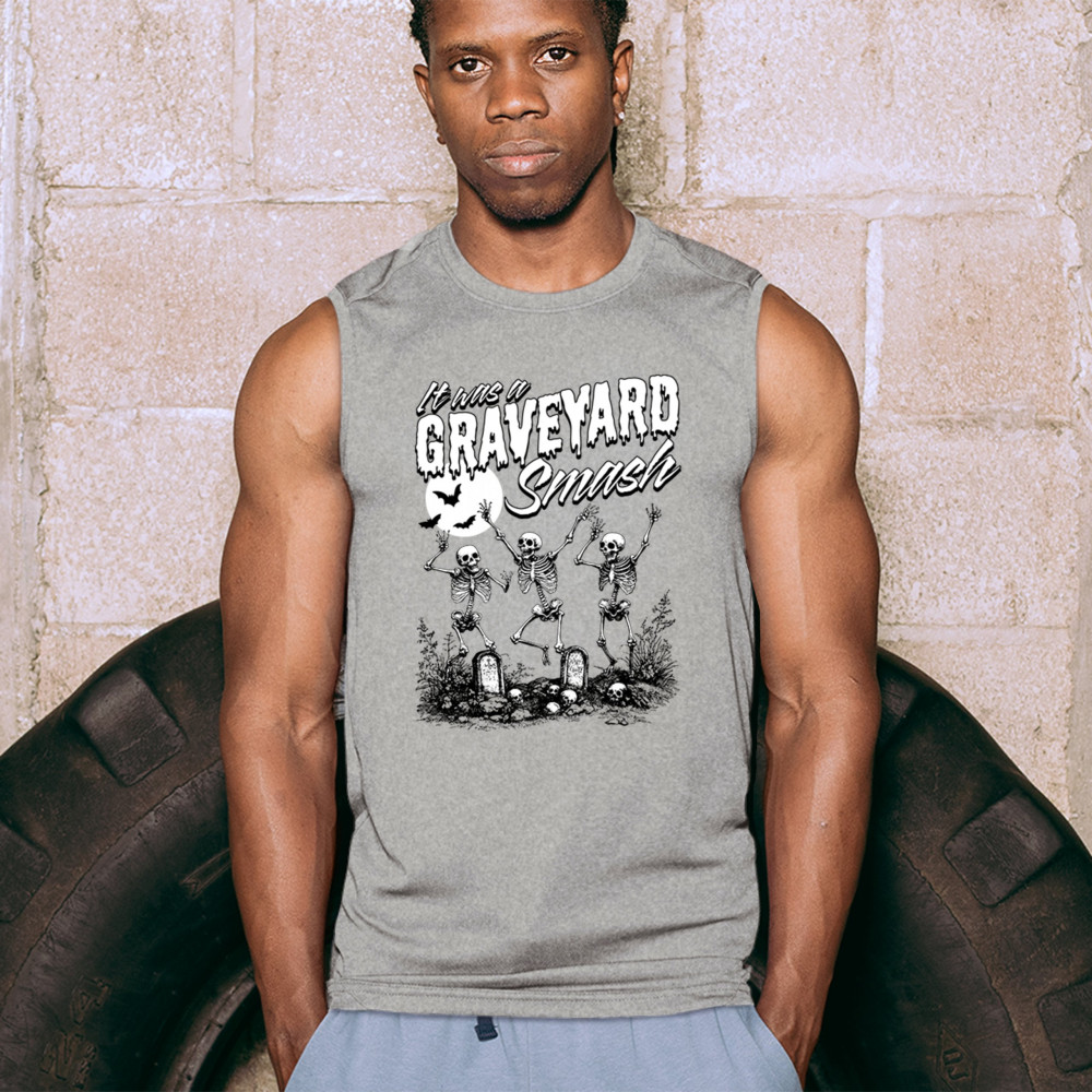 Celebrate Halloween with a fun "Graveyard Smash" design featuring dancing skeletons. Perfect for parties and haunted house events!