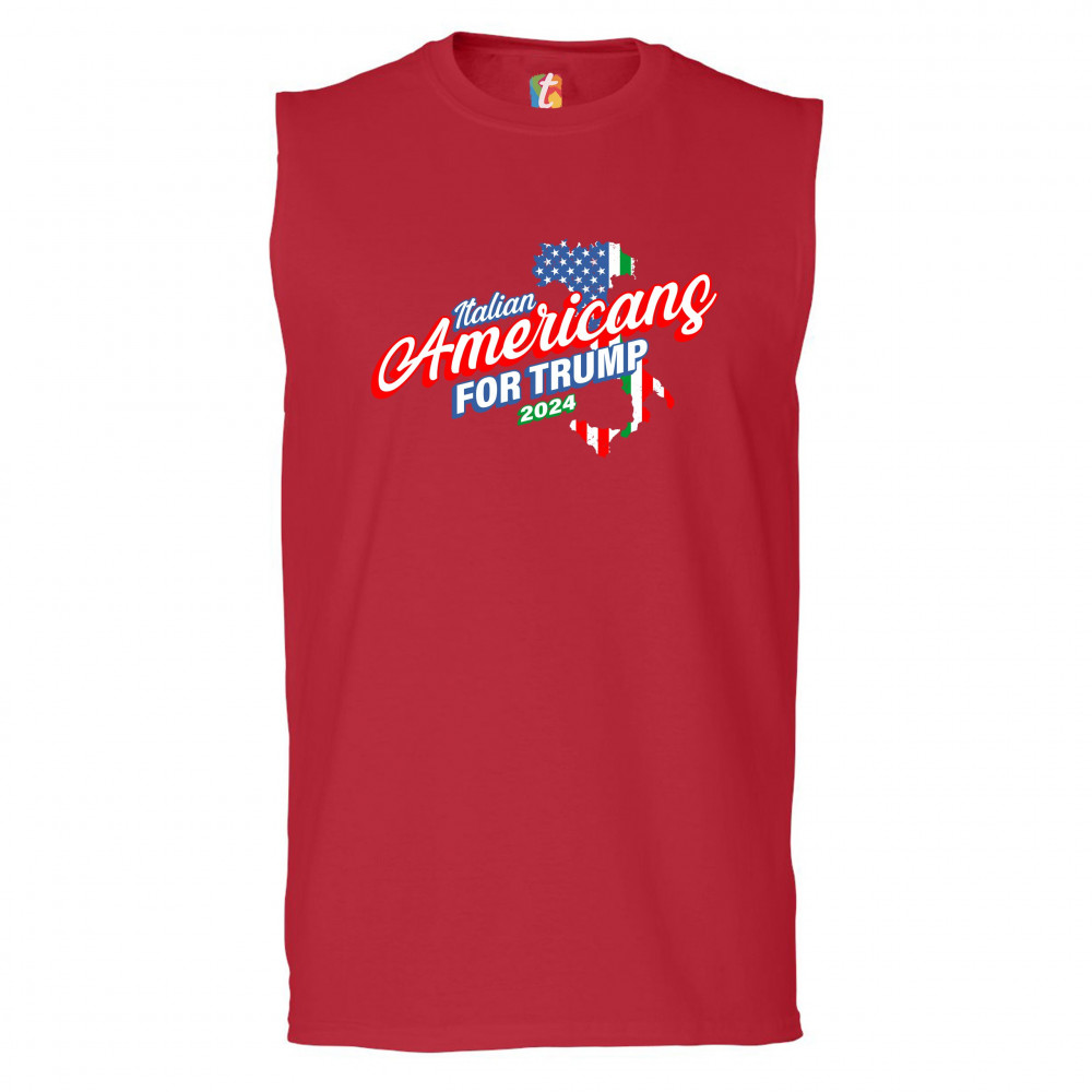 A political print saying "Italian Americans for Trump 2024". The print features a silhouette of Italy in the background with parts of the American and Italian flags inside of it. A great choice to wear for a Trump rally or give as a gift to a Donald Trump
