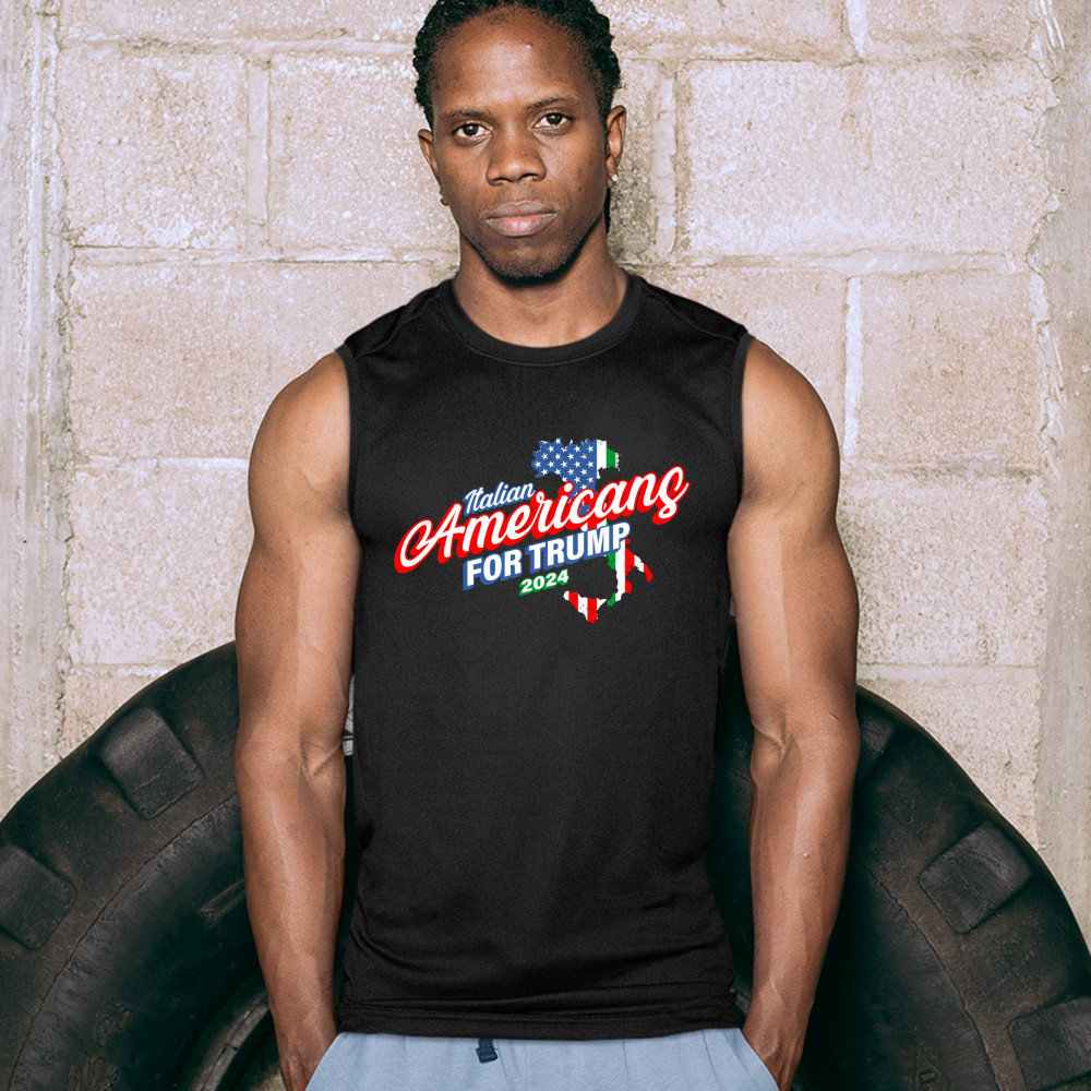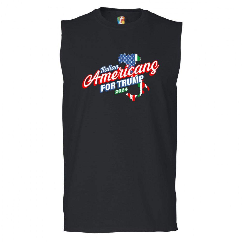 A political print saying "Italian Americans for Trump 2024". The print features a silhouette of Italy in the background with parts of the American and Italian flags inside of it. A great choice to wear for a Trump rally or give as a gift to a Donald Trump