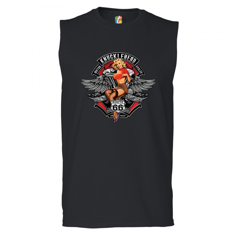 A print featuring a sexy pin-up girl. In front of her legs there is a "Route 66" sign. In the background there is a motorcycle engine and wings behind it. The print says: "Knucklehead motorcycles since 1903. Old time classics. America's finest". A great c