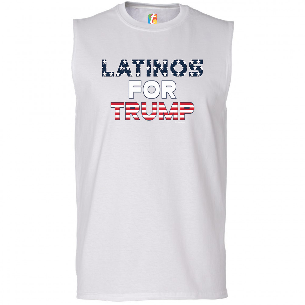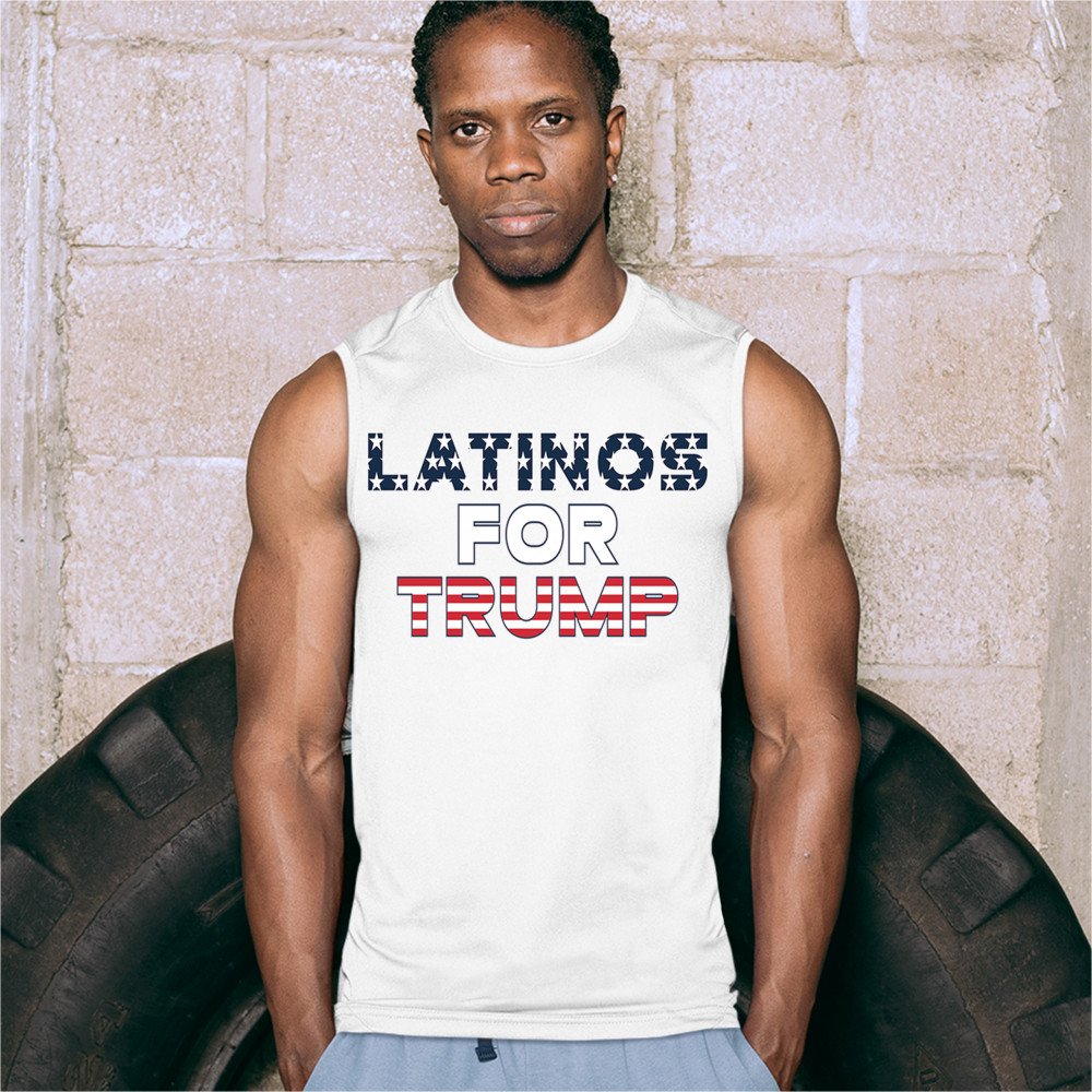 A political print saying "Latinos for Trump". The letters contain the Stars and Stripes of the American flag inside of them. A great choice to wear for a Trump rally or give as a gift to a Donald Trump and Mike Pence supporter before 2020 presidential elections.