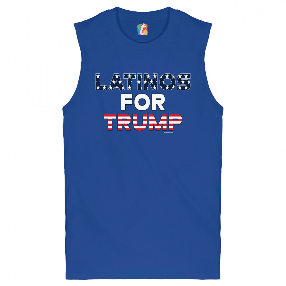 A political print saying "Latinos for Trump". The letters contain the Stars and Stripes of the American flag inside of them. A great choice to wear for a Trump rally or give as a gift to a Donald Trump and Mike Pence supporter before 2020 presidential elections.