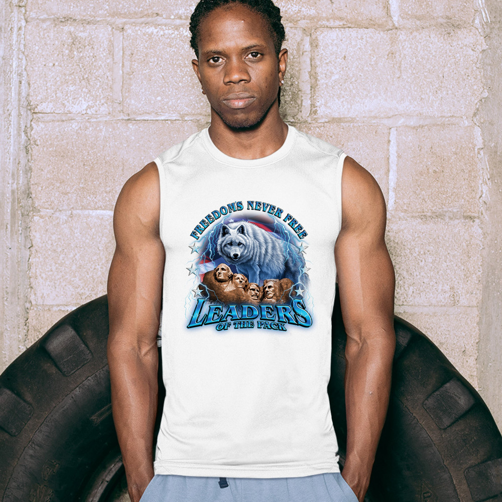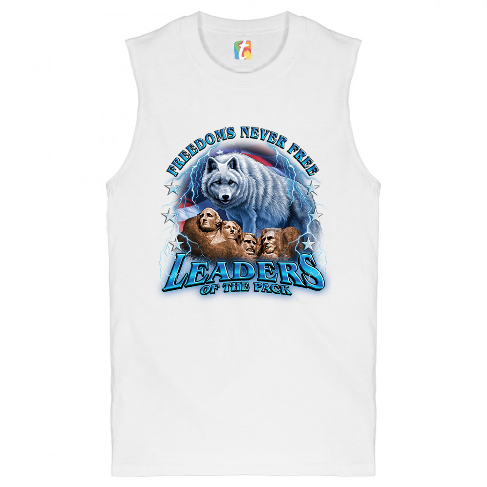 A patriotic print featuring the Mount Rushmore. There is a huge white wolf with the American flag in the background and lightning strikes all over the place. The print says: "Freedom's Never Free, Leaders of the Pack". Great choice to wear on Independence
