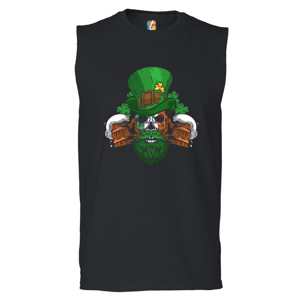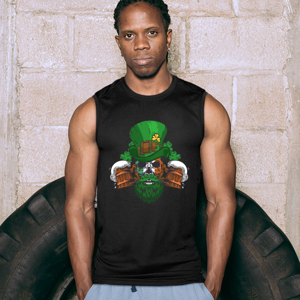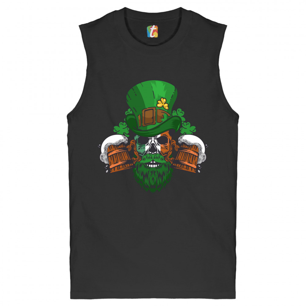 A print featuring a skull with green beard and Irish flag face. The skull is wearing a leprechaun hat. There are two beer mugs and numerous shamrocks around the skull. A great choice to wear on March 17 to celebrate the St. Patrick's Day and showcase your