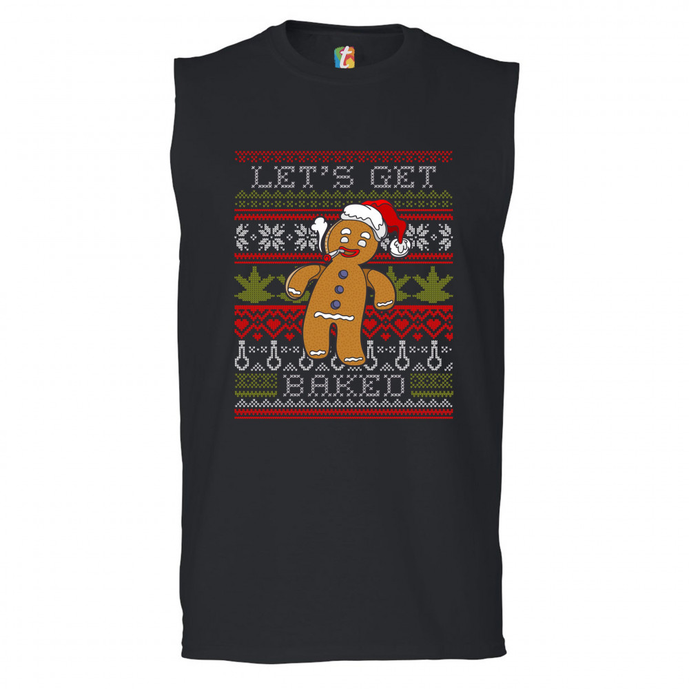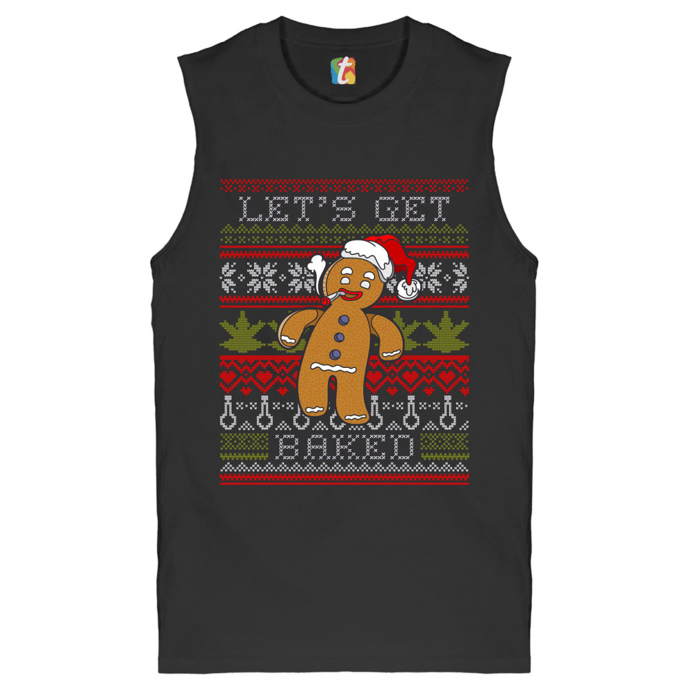 LET'S GET BAKED muscle shirt ugly sweater gingerbread man 420 marijuana men's black