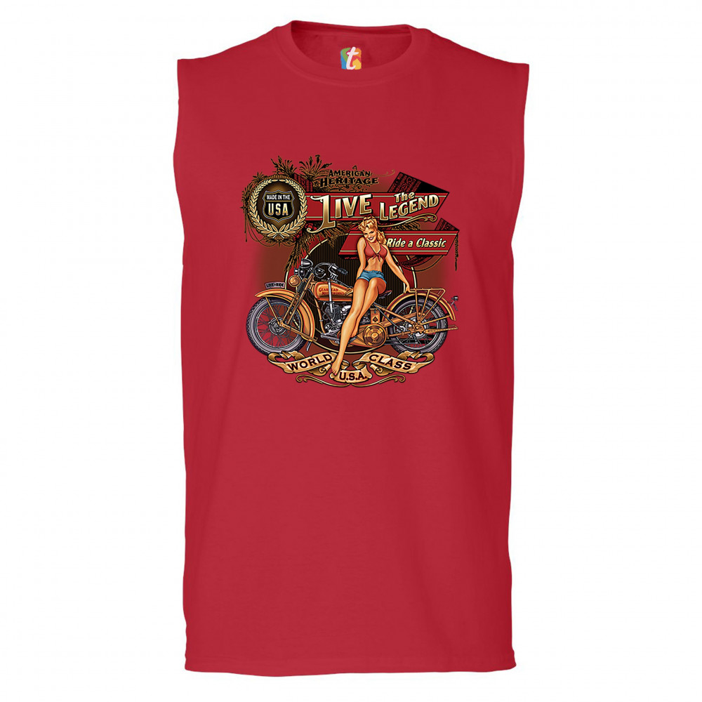 A print featuring a vintage motorcycle with a sexy girl sitting on top of it. On multiple stripes or signs the print says: "American Heritage, Made in the USA, Live the Legend, Ride a Classic, Live to Ride, World Class U.S.A." A great choice for a motorcy
