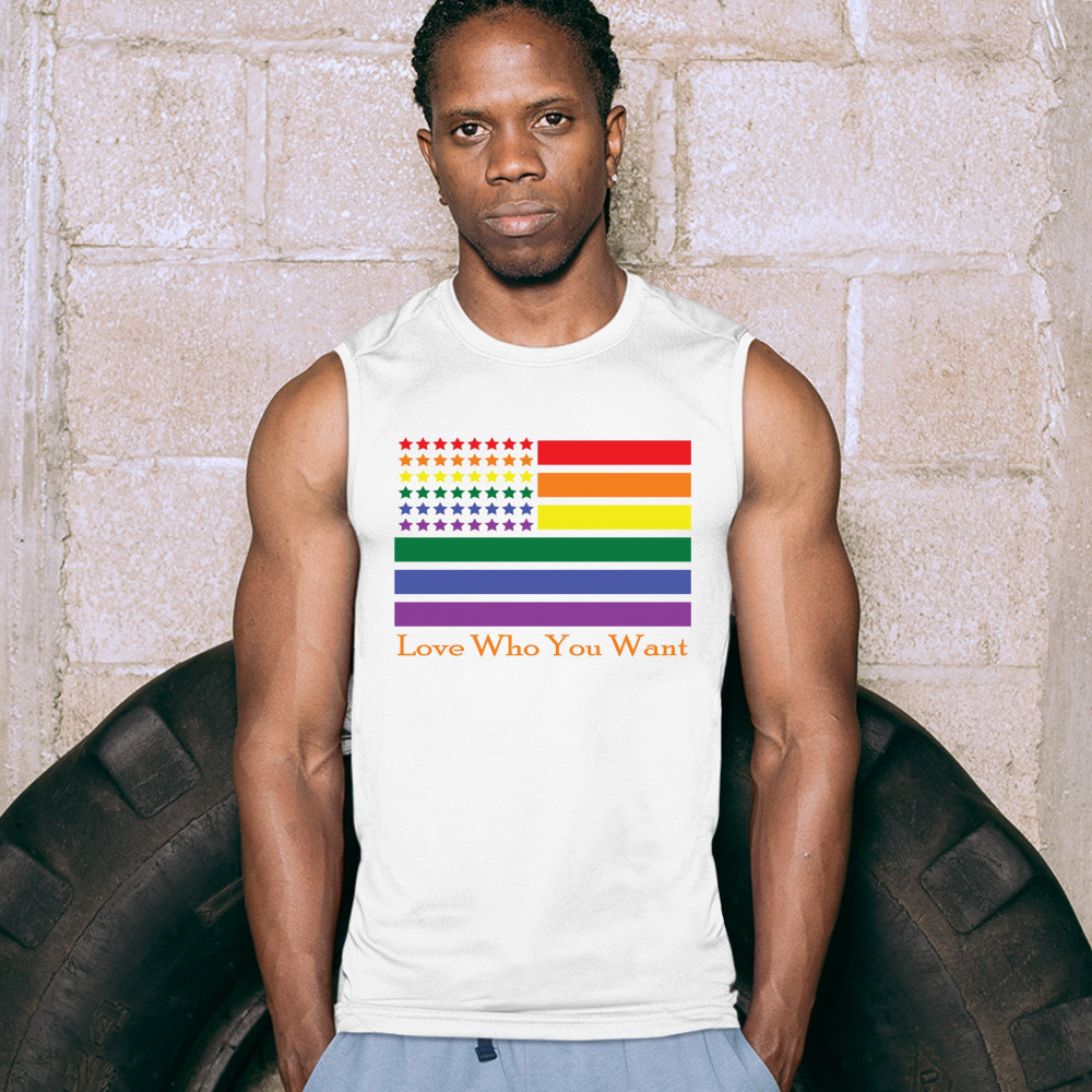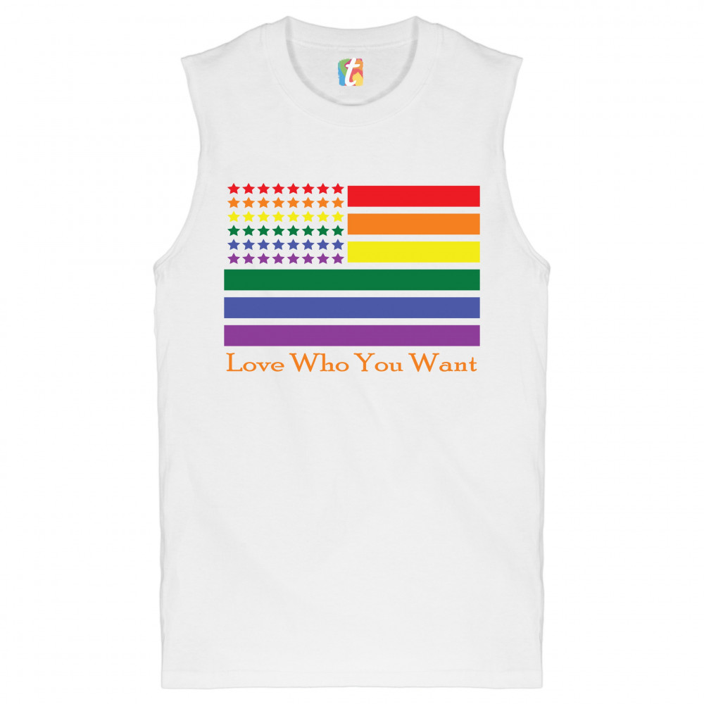 LOVE WHO YOU WANT muscle shirt american gay pride rainbow flag lgbt men's white
