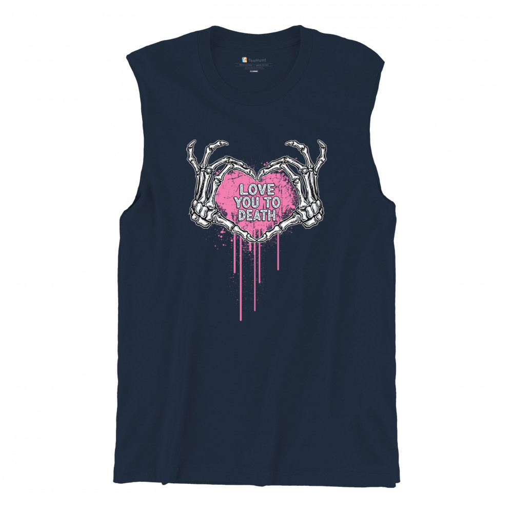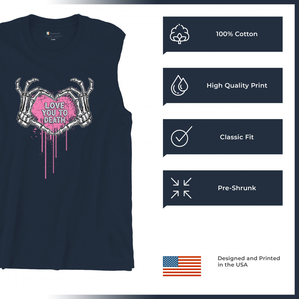 Show your spooky side with this skeleton hands heart design featuring a pink background and the phrase "Love You to Death." A perfect piece for alternative couples, Halloween lovers, and romantic rebels who embrace both affection and dark humor. Great for spooky season, date nights, and alt fashion outfits.