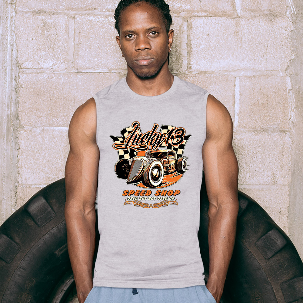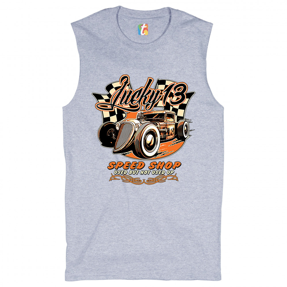 LUCKY 13 SPEED SHOP muscle shirt rat rod route 66 vintage racing car men's gray