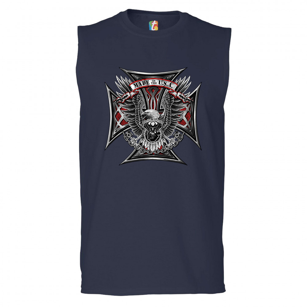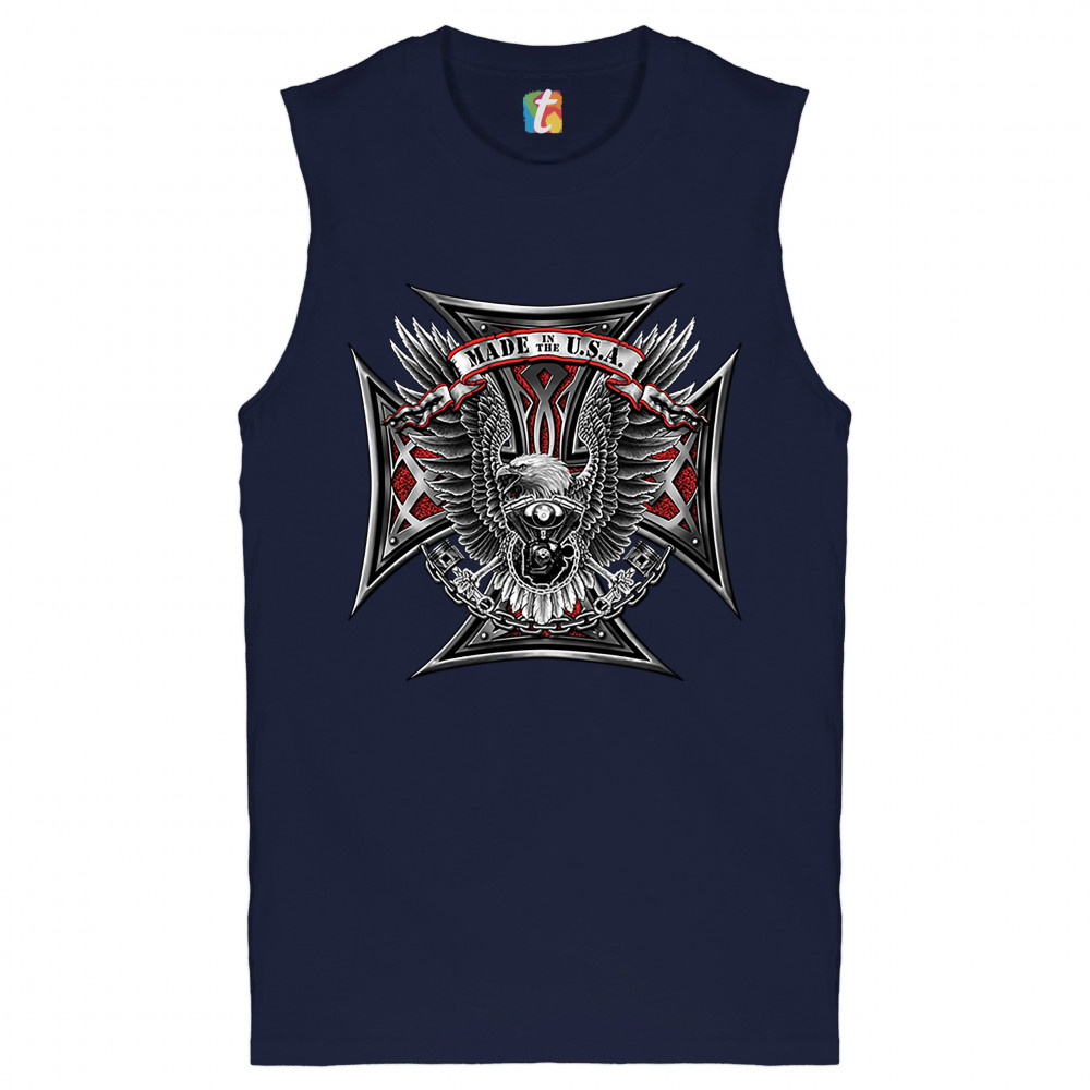 A print featuring a huge cross. In the front there is a bald eagle spreading it's wings and holding pistons in it's talons. In front of it's chest there is a V engine. At the top there is a stripe with "Made in the USA" written on it. A great choice for a