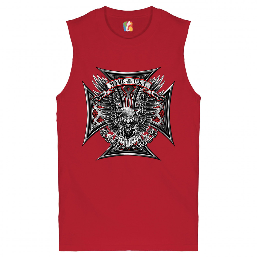 A print featuring a huge cross. In the front there is a bald eagle spreading it's wings and holding pistons in it's talons. In front of it's chest there is a V engine. At the top there is a stripe with "Made in the USA" written on it. A great choice for a
