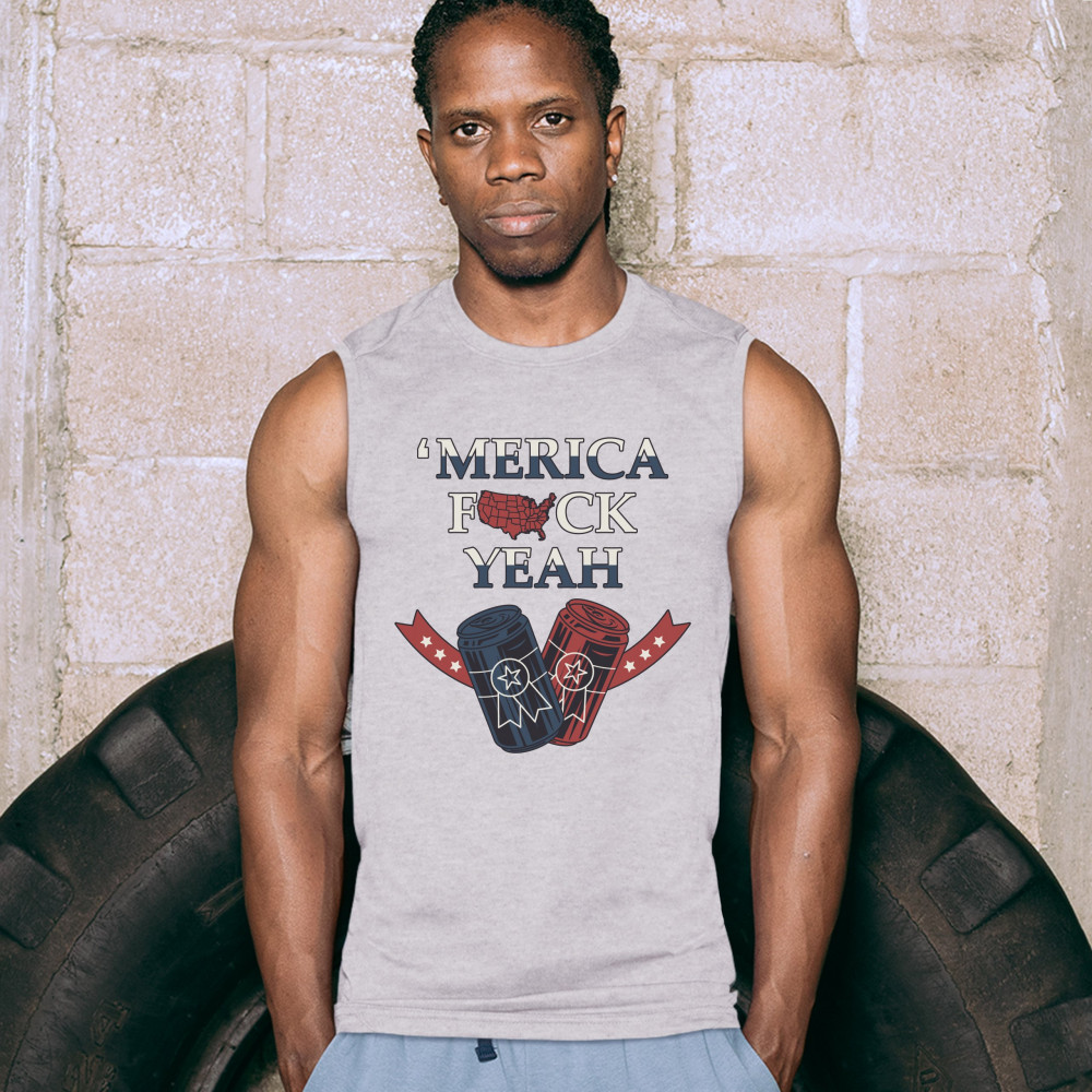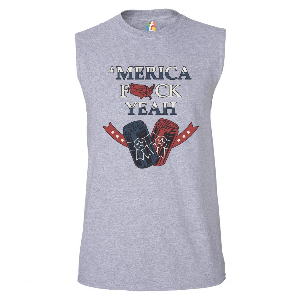 MERICA F*CK YEAH muscle shirt patriotic american pride drinking beer men's gray