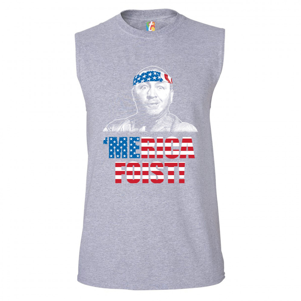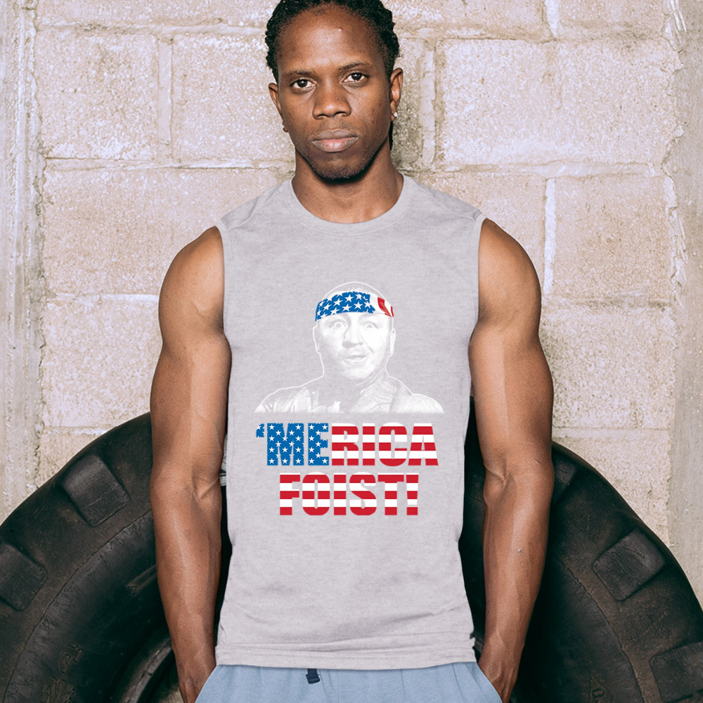 A funny patriotic print saying: "'Merica Foist" and depicting grinning Curly Howard wearing an American flag bandana. The words are decorated with the Stars and Stripes of the American flag. A great gift for anyone who is a fan of the legendary TV show.