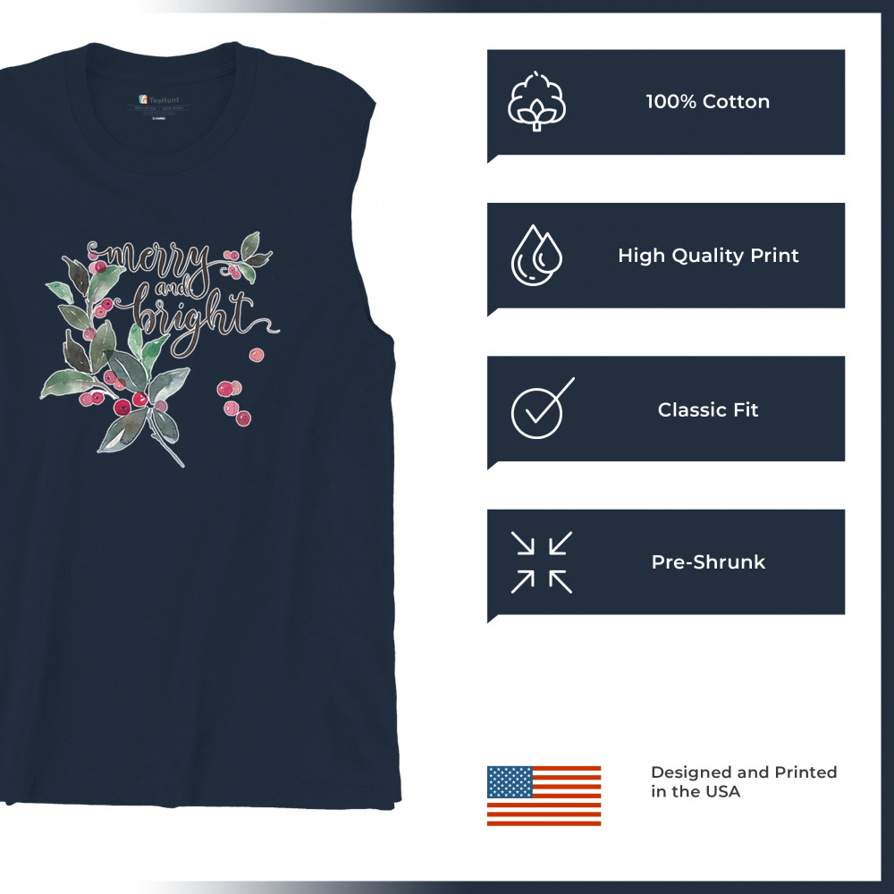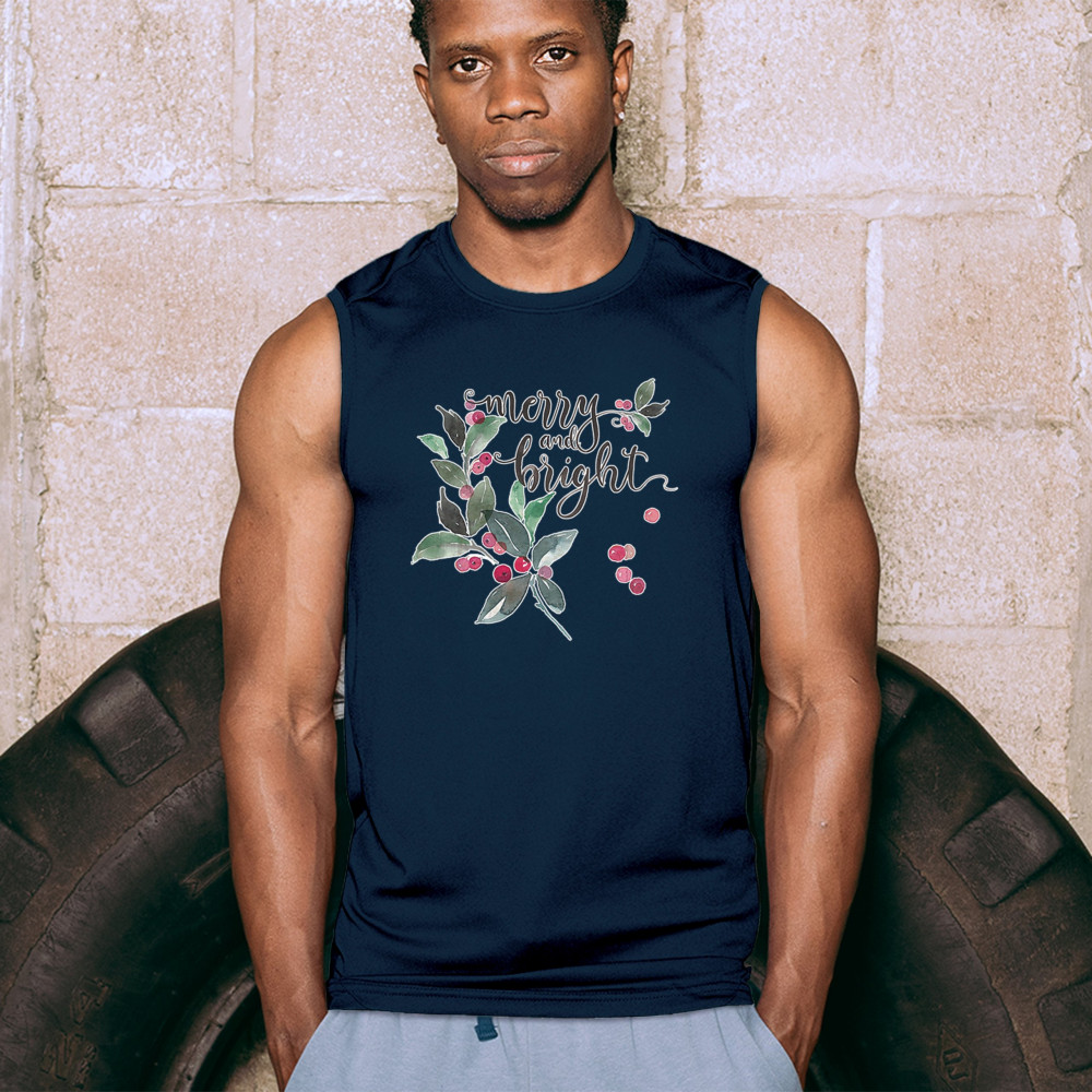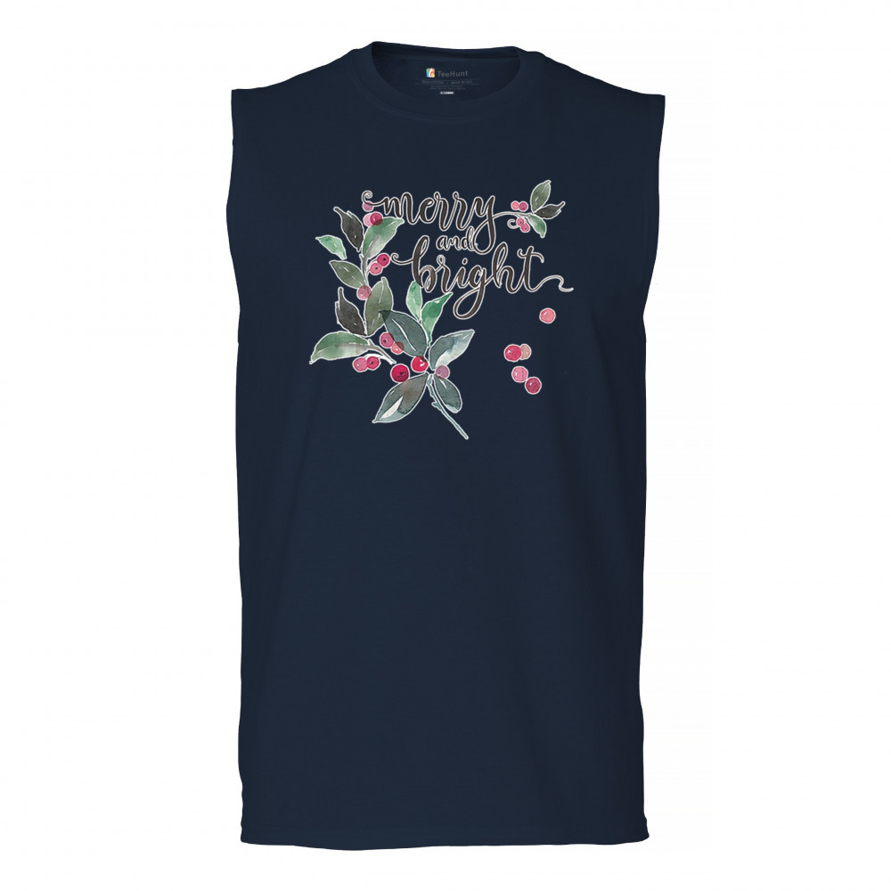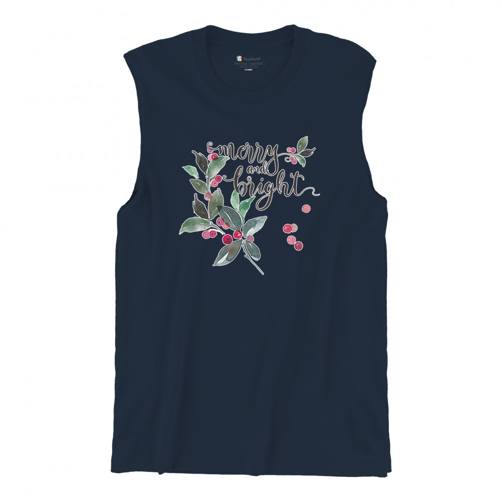 MERRY AND BRIGHT CUTE CHRISTMAS muscle shirt jolly santa clause xmas men's navy blue