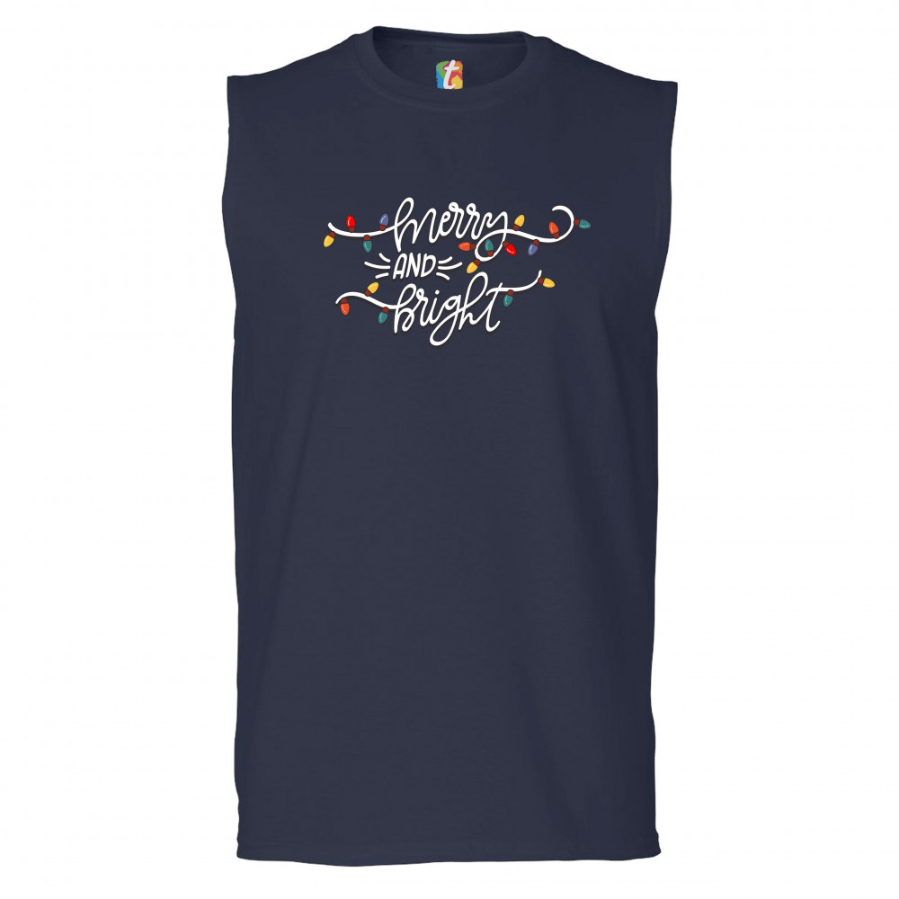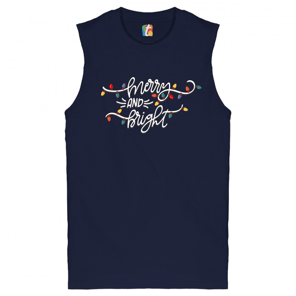 MERRY AND BRIGHT muscle shirt christmas eve holiday spirit festive men's navy blue