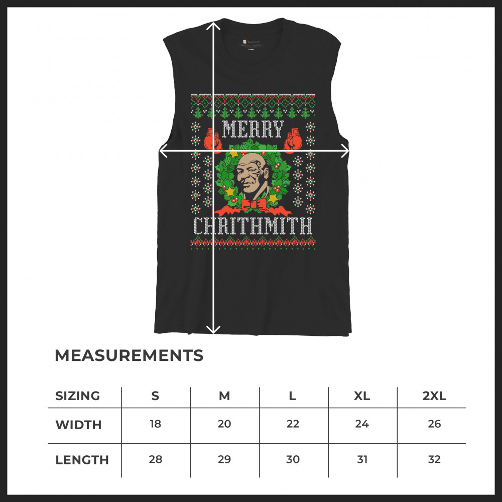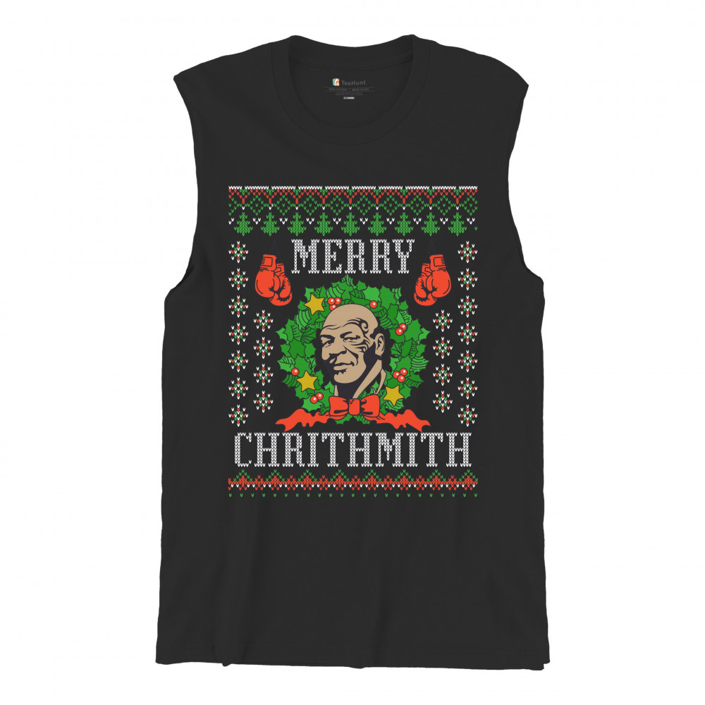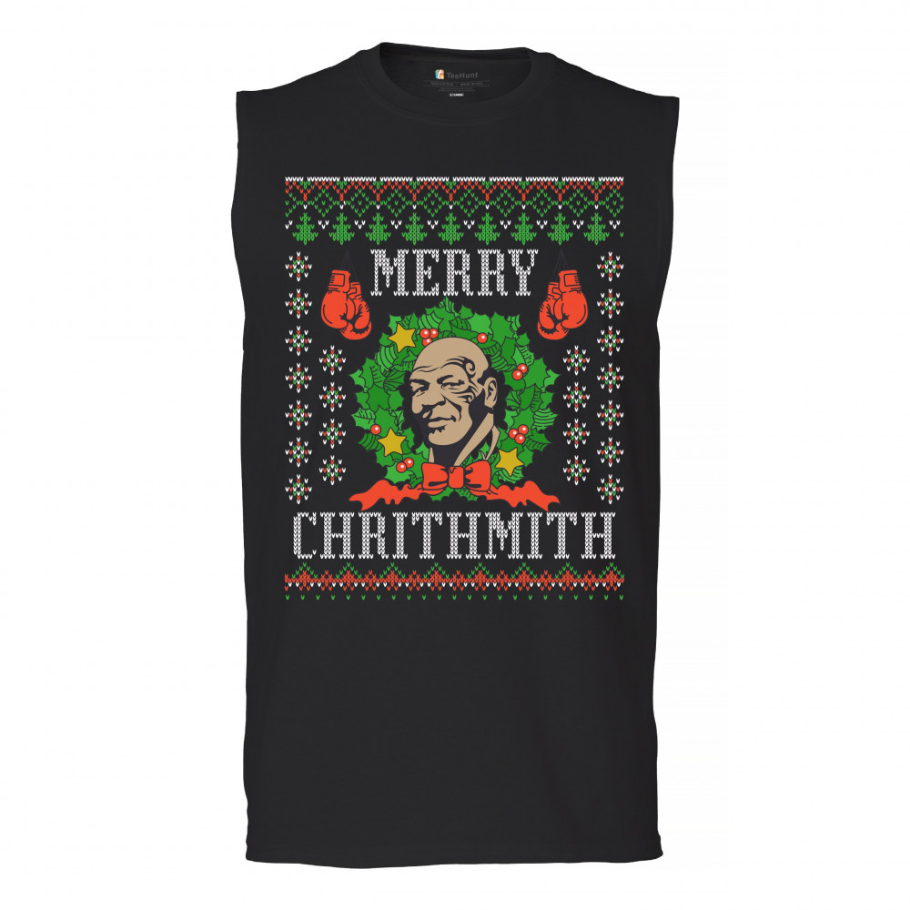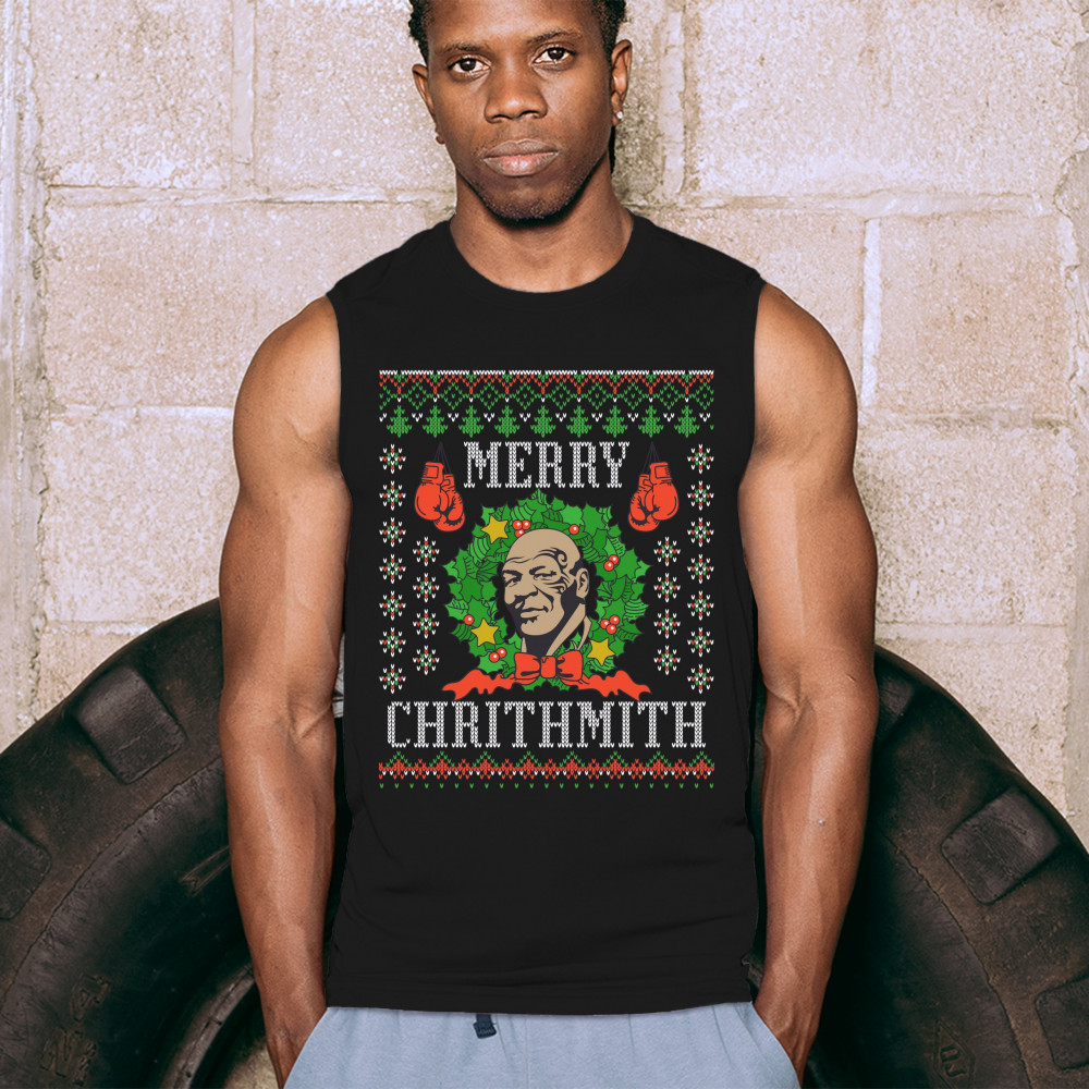 A print saying: "Merry Chrithmith" and featuring the face of Mike Tyson inside of a Christmas chaplet and two pairs of boxing gloves. The print is designed as an ugly sweater. Amazing choice to make people smile and spread positive vibes on Christmas Eve.