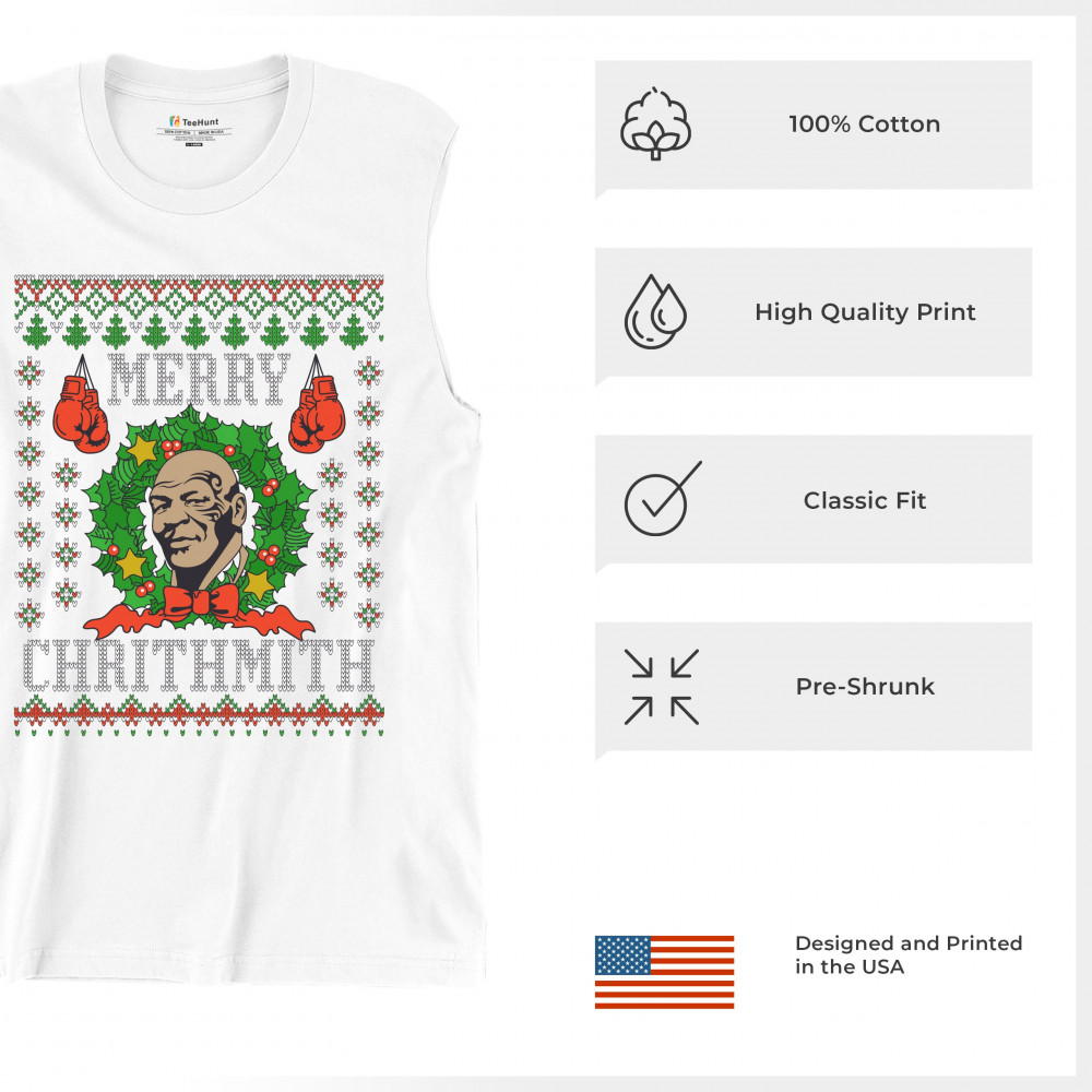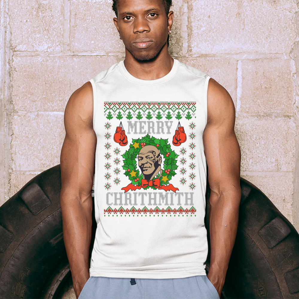 A print saying: "Merry Chrithmith" and featuring the face of Mike Tyson inside of a Christmas chaplet and two pairs of boxing gloves. The print is designed as an ugly sweater. Amazing choice to make people smile and spread positive vibes on Christmas Eve.