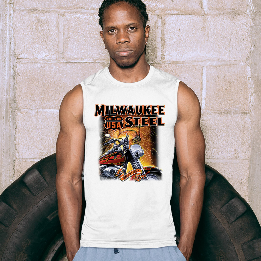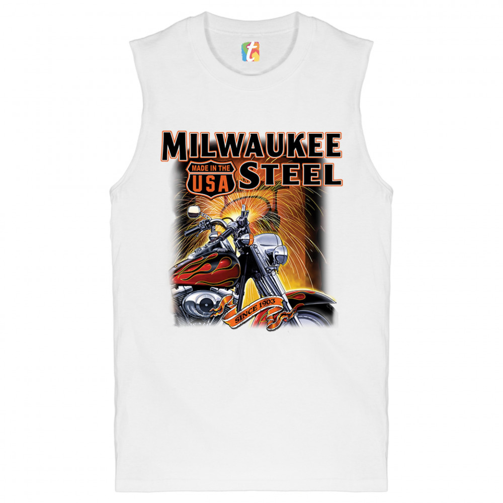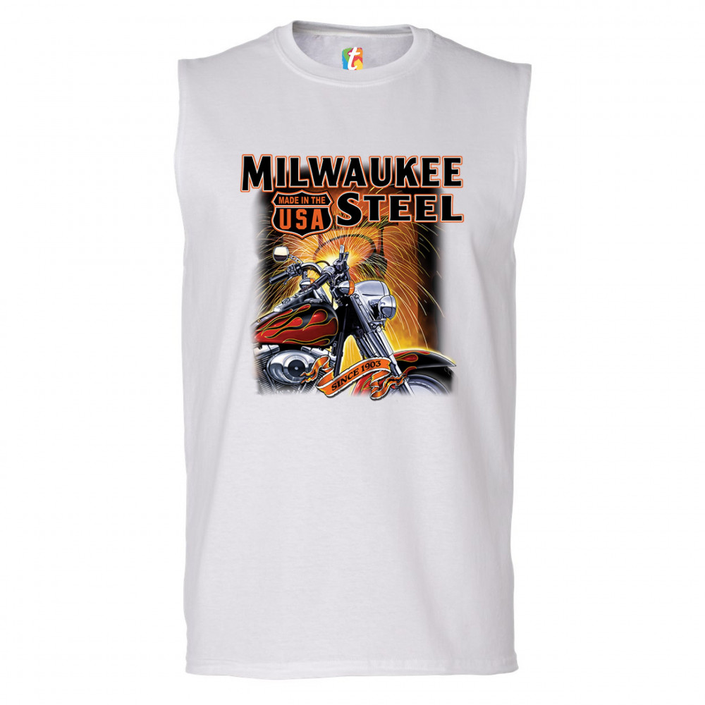 A print featuring a motorcycle in the front and a melting furnace in the background with sparkles flying all over the place. The print says: "Milwaukee Steel". There is also a sign that says "made in the USA" and a stripe with "since 1903" written on it.