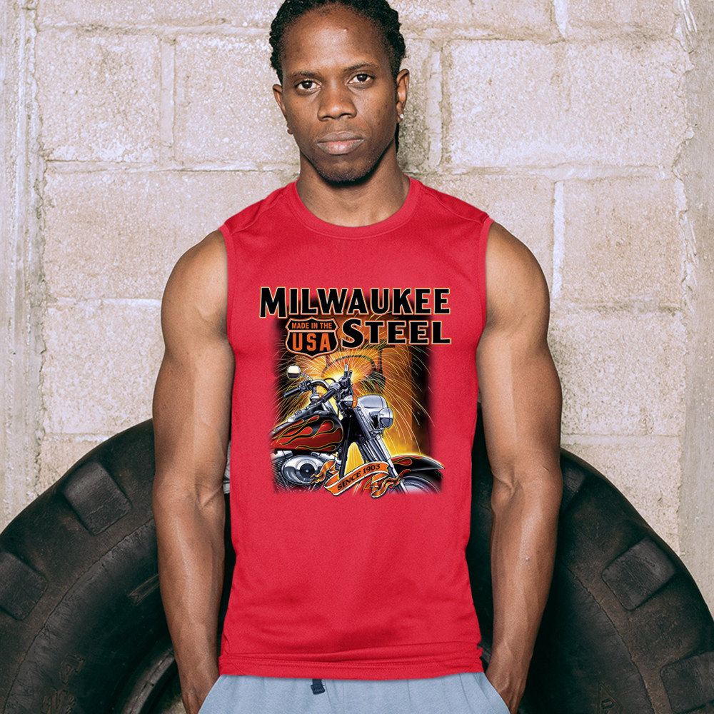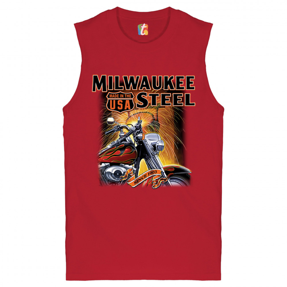 A print featuring a motorcycle in the front and a melting furnace in the background with sparkles flying all over the place. The print says: "Milwaukee Steel". There is also a sign that says "made in the USA" and a stripe with "since 1903" written on it.