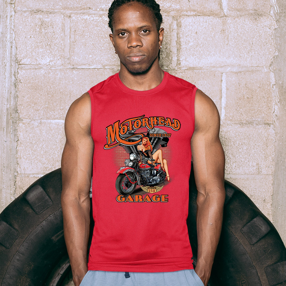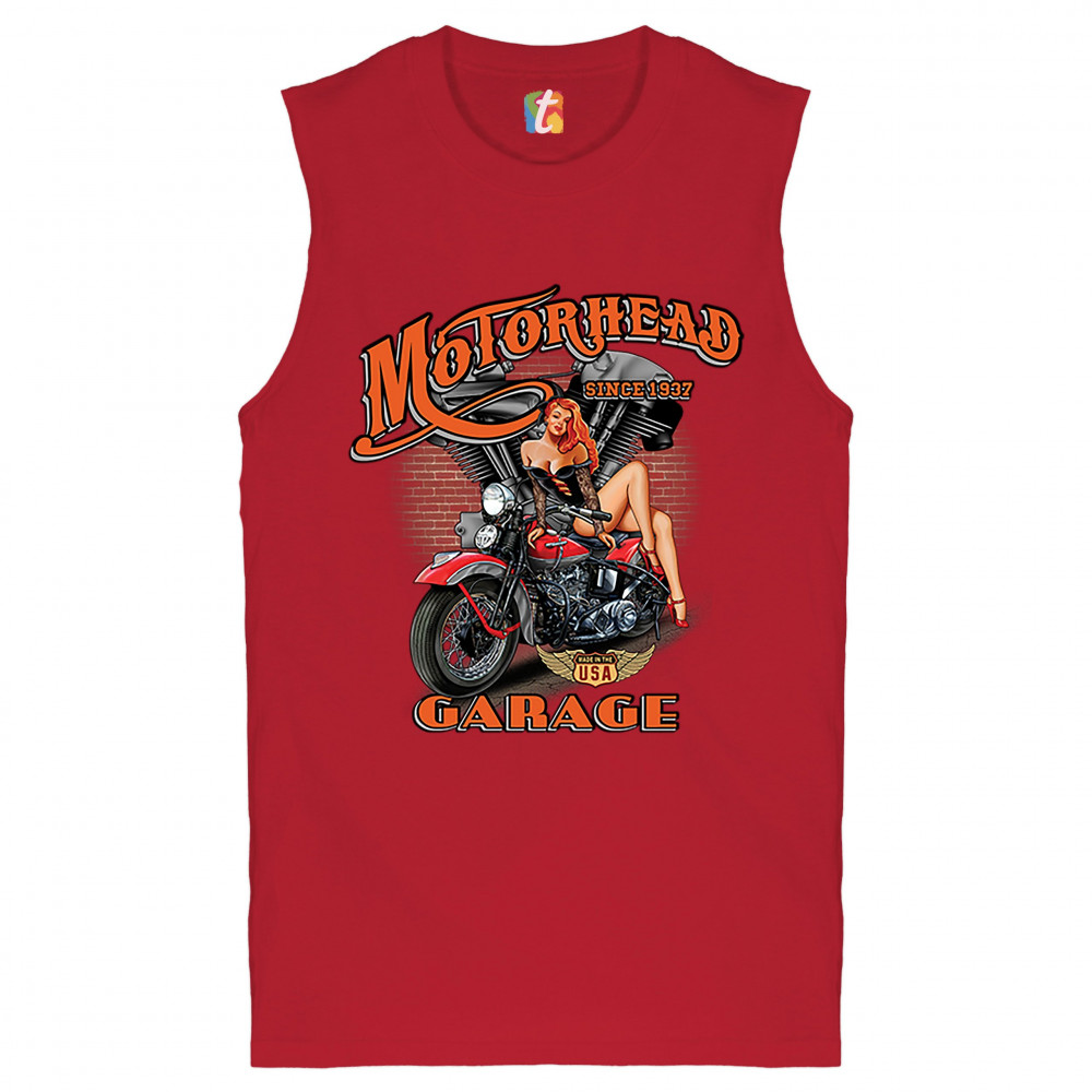 A print featuring a sexy pin-up girl sitting on a motorcycle. In the background there is a motorcycle engine and a brick wall. The print says: "Motorhead Garage since 1937" and features a "Made in the USA" sign. A great choice for a motorcycle enthusiast.