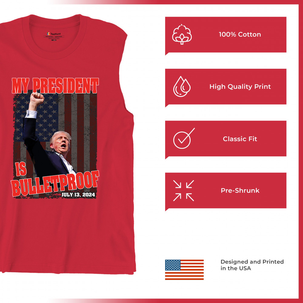 Support Trump with our "My President is Bulletproof" design, perfect for rallies and everyday wear. Show your patriotic pride and conservative values.
